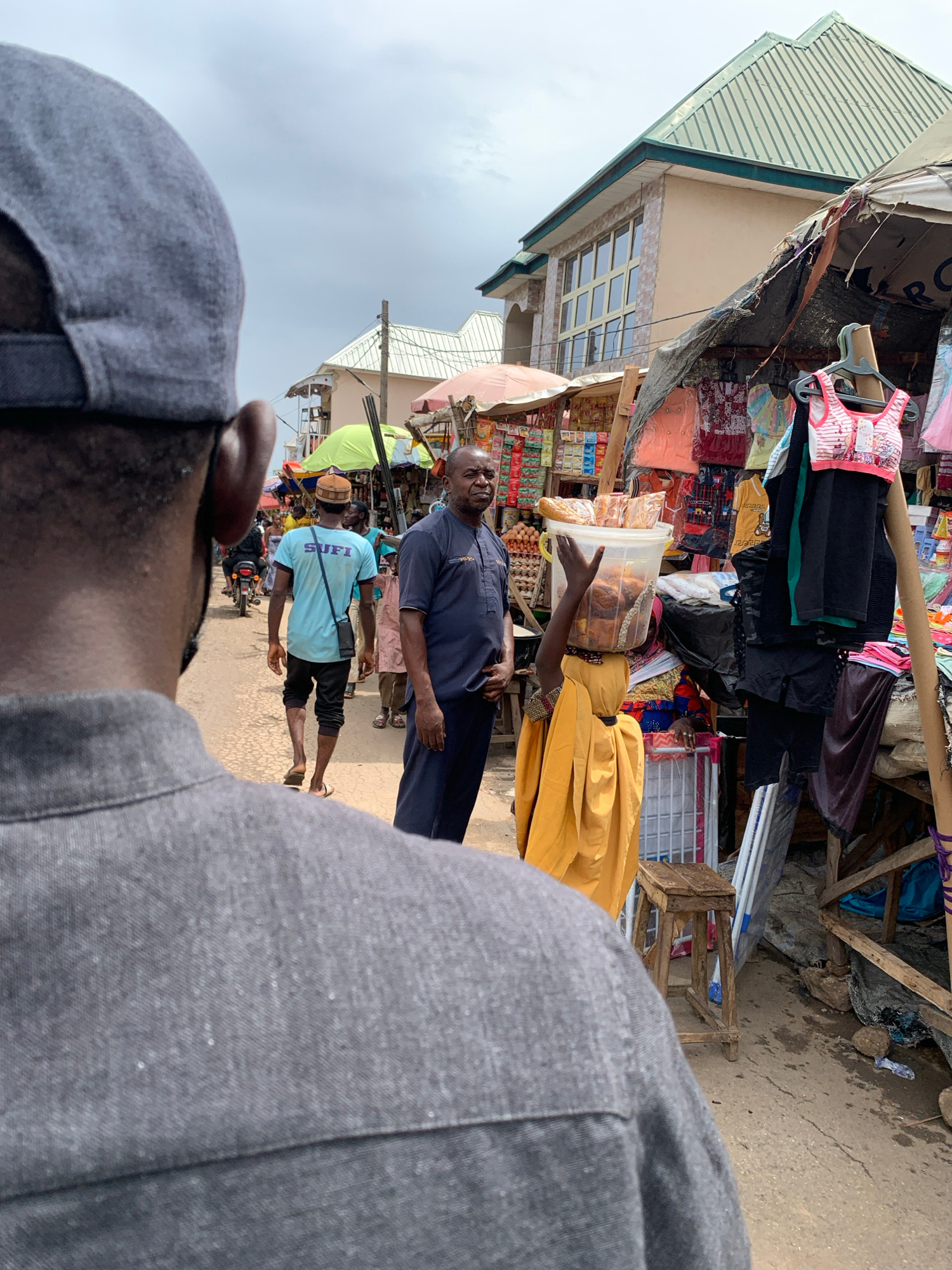 The image depicts a street scene in Keffi, Nigeria, as captured from a first-person perspective. In the foreground, the photographer's grey cap and shoulder are visible. The main focus is on a man in…read more