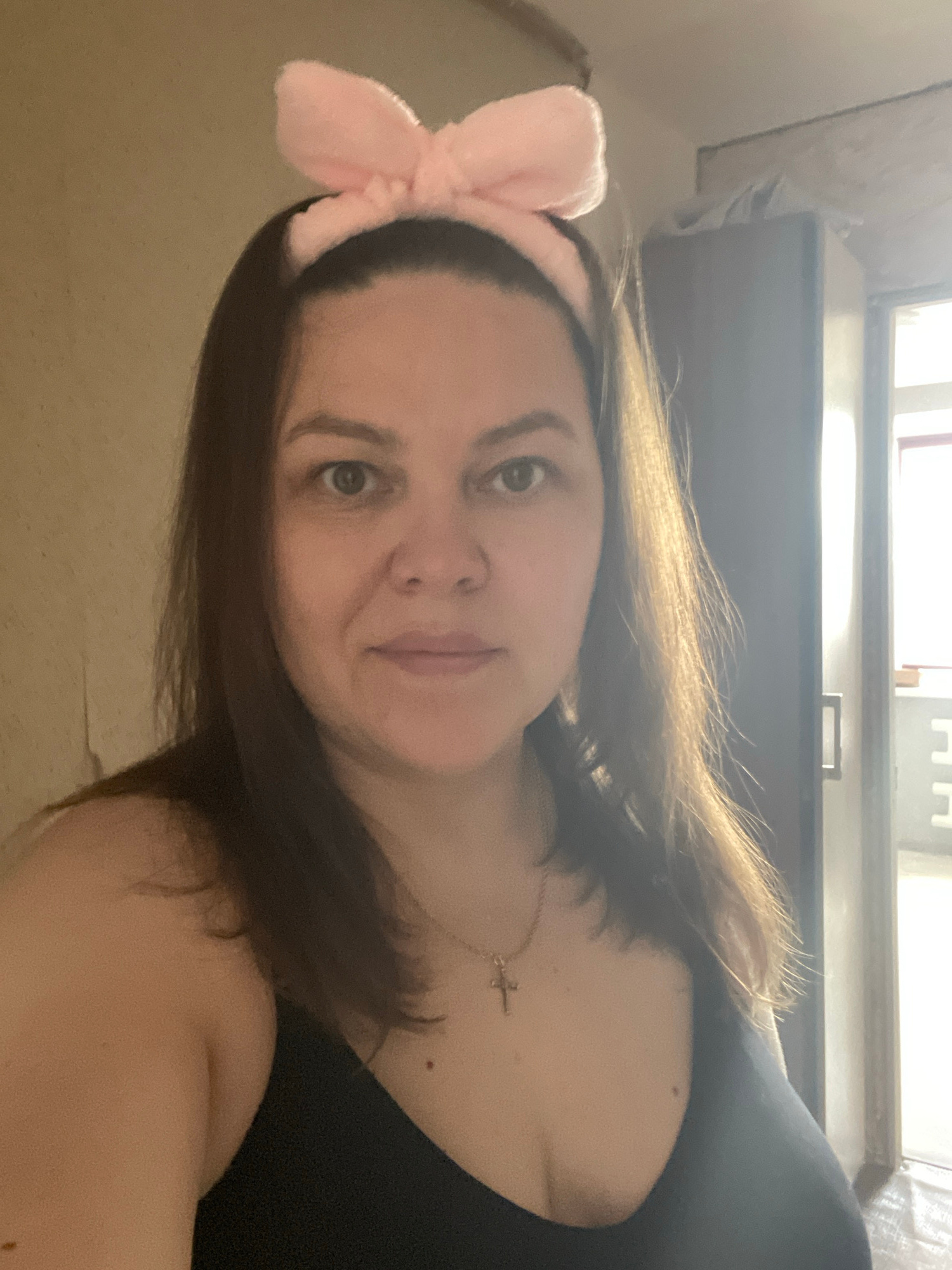 A woman with shoulder-length brown hair is facing the camera. She is wearing a black top and a pink headband with a bow on top of her head. She also appears to be wearing a gold chain necklace with a…read more
