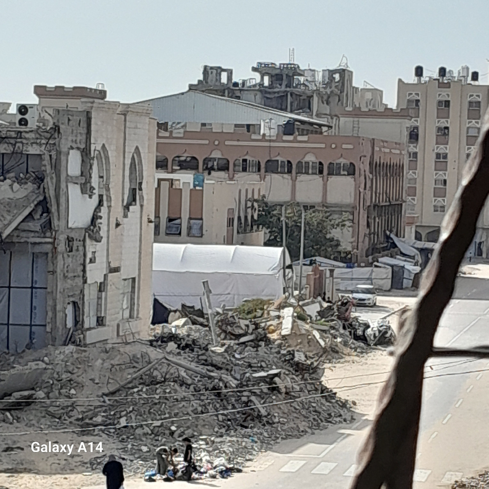 This image captures a scene of extensive urban destruction in Khan Yunis, Palestinian Territory, under a bright, clear daytime sky. The photograph is taken from a slightly elevated vantage point, look…read more
