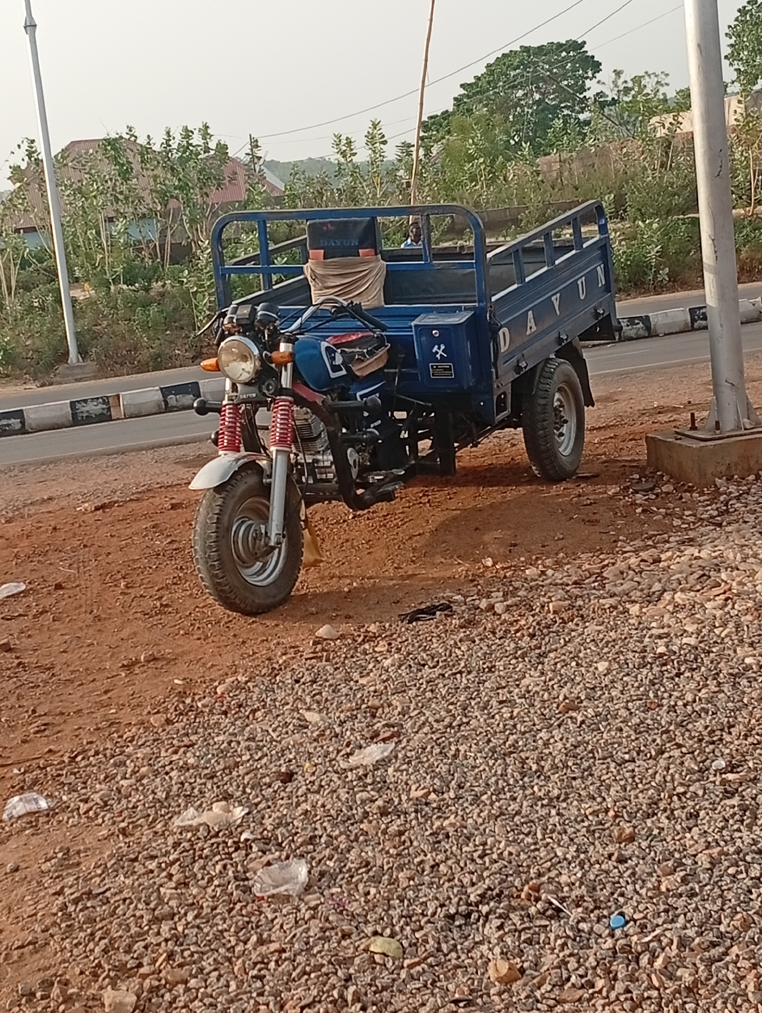 The image depicts a blue "DAYUN" branded three-wheeled motorcycle parked on a patch of gravel and reddish-brown soil beside a road. The vehicle has a truck bed behind the motorcycle section. A person…read more