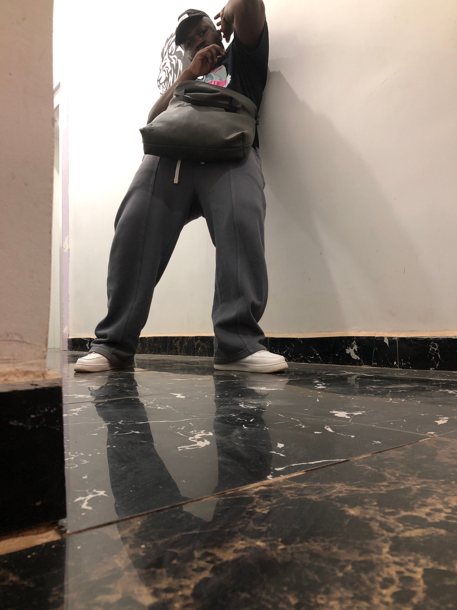 A man stands against a white wall with a black-and-gold marbled floor at Gura Top, Nigeria. He wears a black t-shirt, grey sweatpants, and white sneakers, and a grey bag hangs on his shoulder. He appe…read more