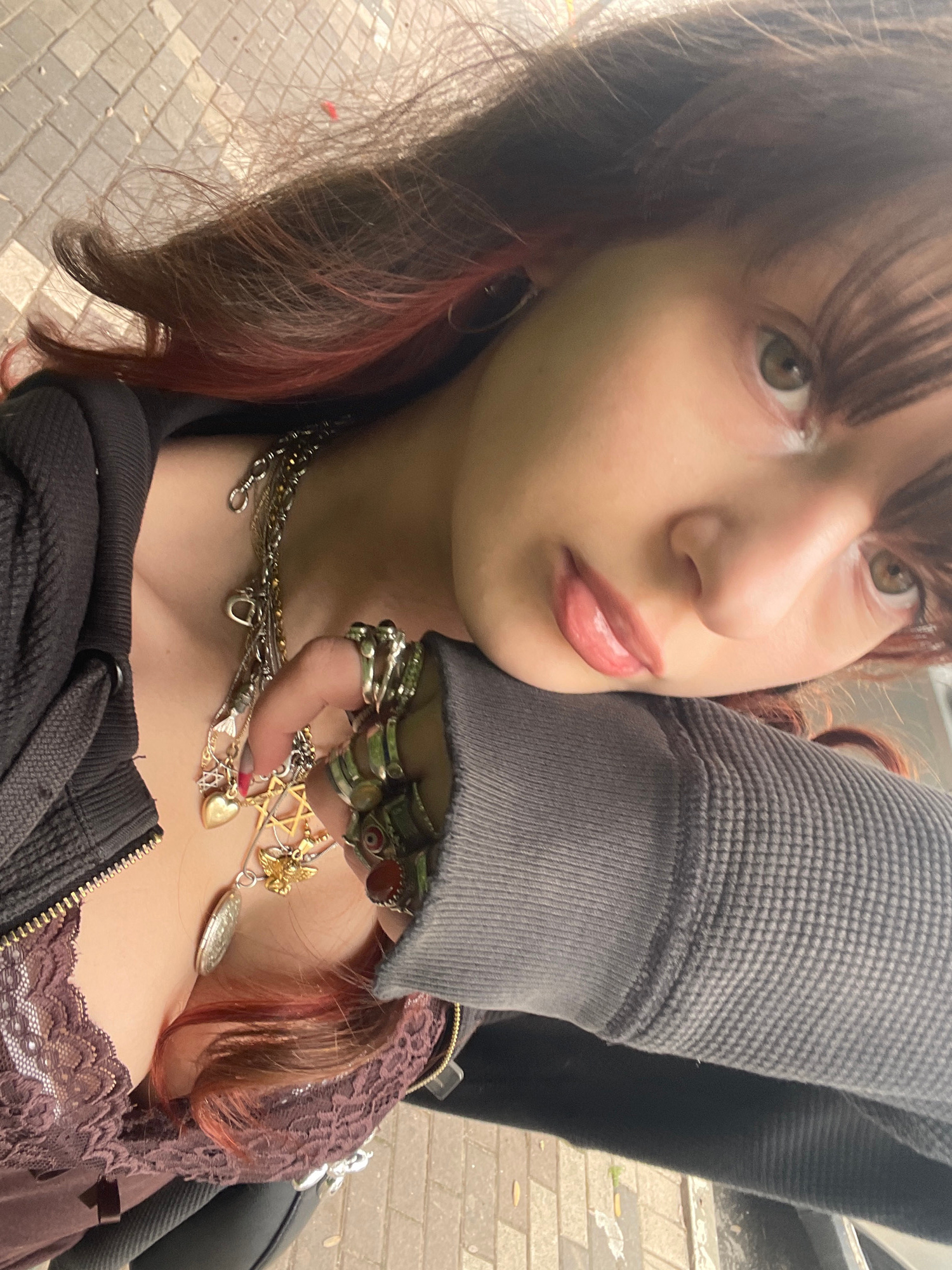 A close-up selfie of a young woman with brown hair and bangs, the ends dyed red. She is wearing a dark gray waffle-knit long sleeve shirt, a dark brown zippered hoodie, and a brown lace top. She has n…read more