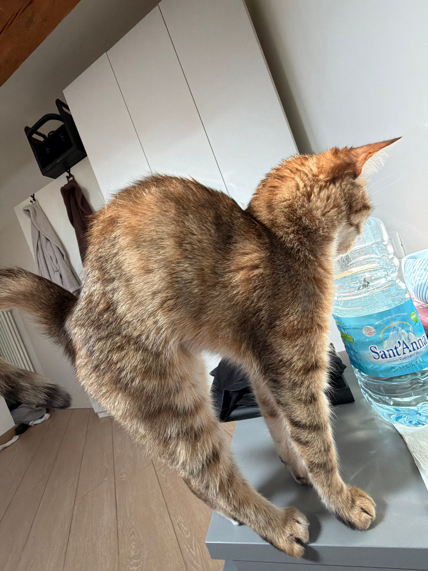 A domestic cat, likely a tabby or torbie breed, with brown, tan, and darker striped fur, is captured in an indoor setting. The cat is in an elongated pose, either stretching or climbing onto a light-c…read more