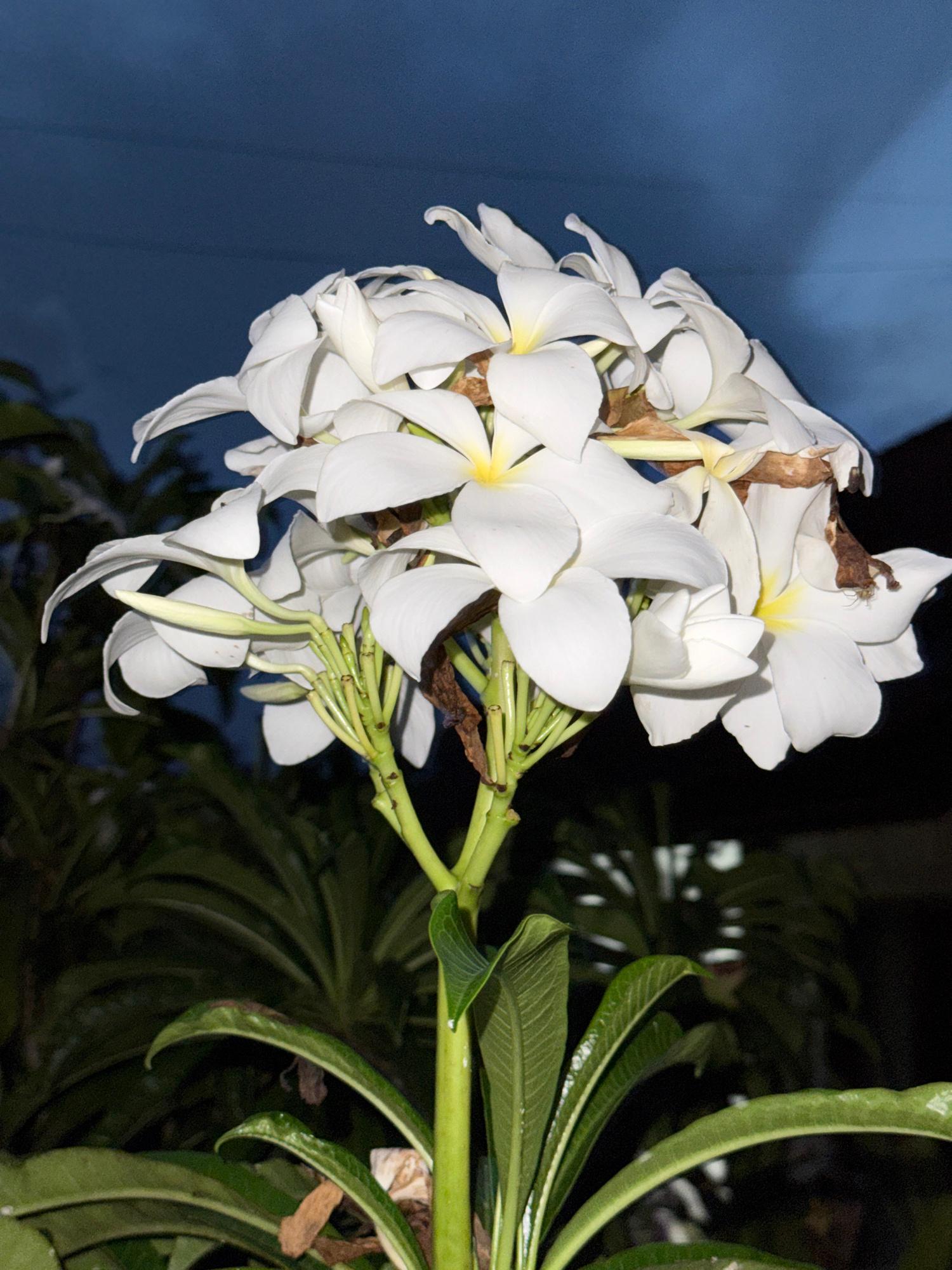 A cluster of white and yellow plumeria flowers is in focus in the image, set against a blurred background that includes dark green leaves and a dark blue wall. The leaves are long and narrow, with a g…read more