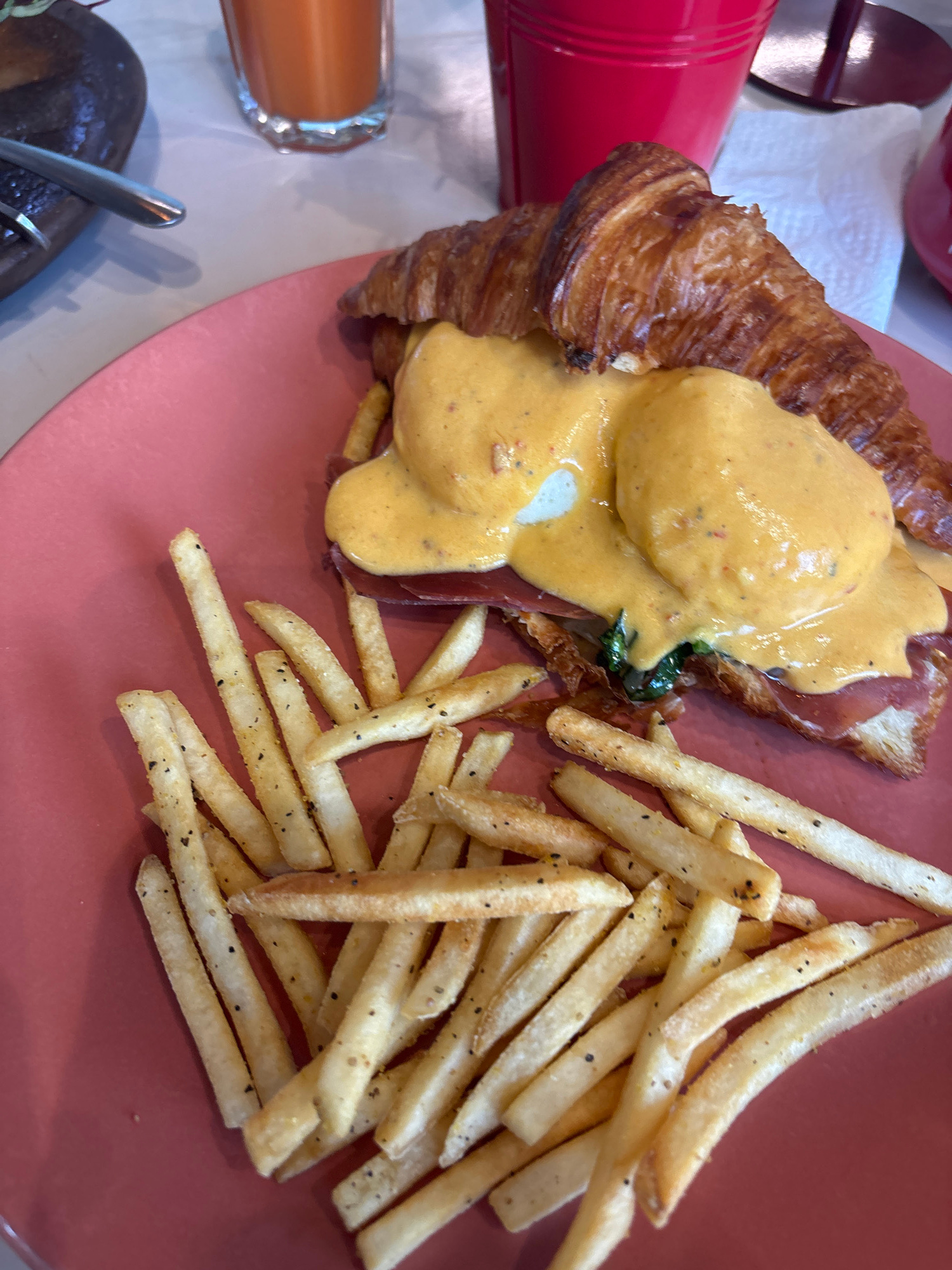 A close-up shot of a plate of food. The main course is a croissant sandwich topped with an egg and a yellow sauce, served with a side of french fries. A glass of juice, a red container and some silver…read more