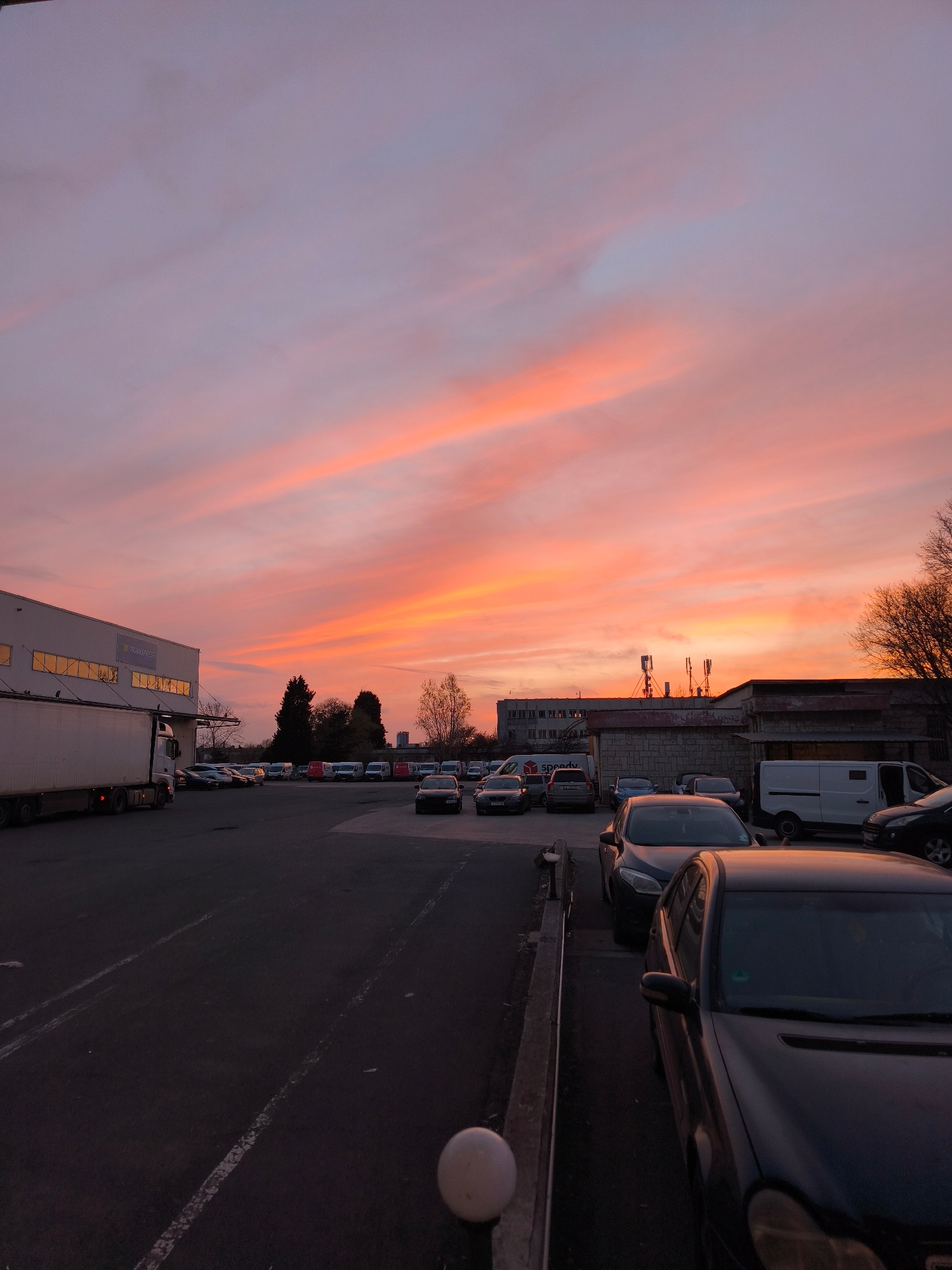 The image presents an industrial or commercial parking lot scene at sunset in Burgas, Bulgaria. The most striking element is the sky, ablaze with vibrant hues of orange, pink, and purple clouds that s…read more