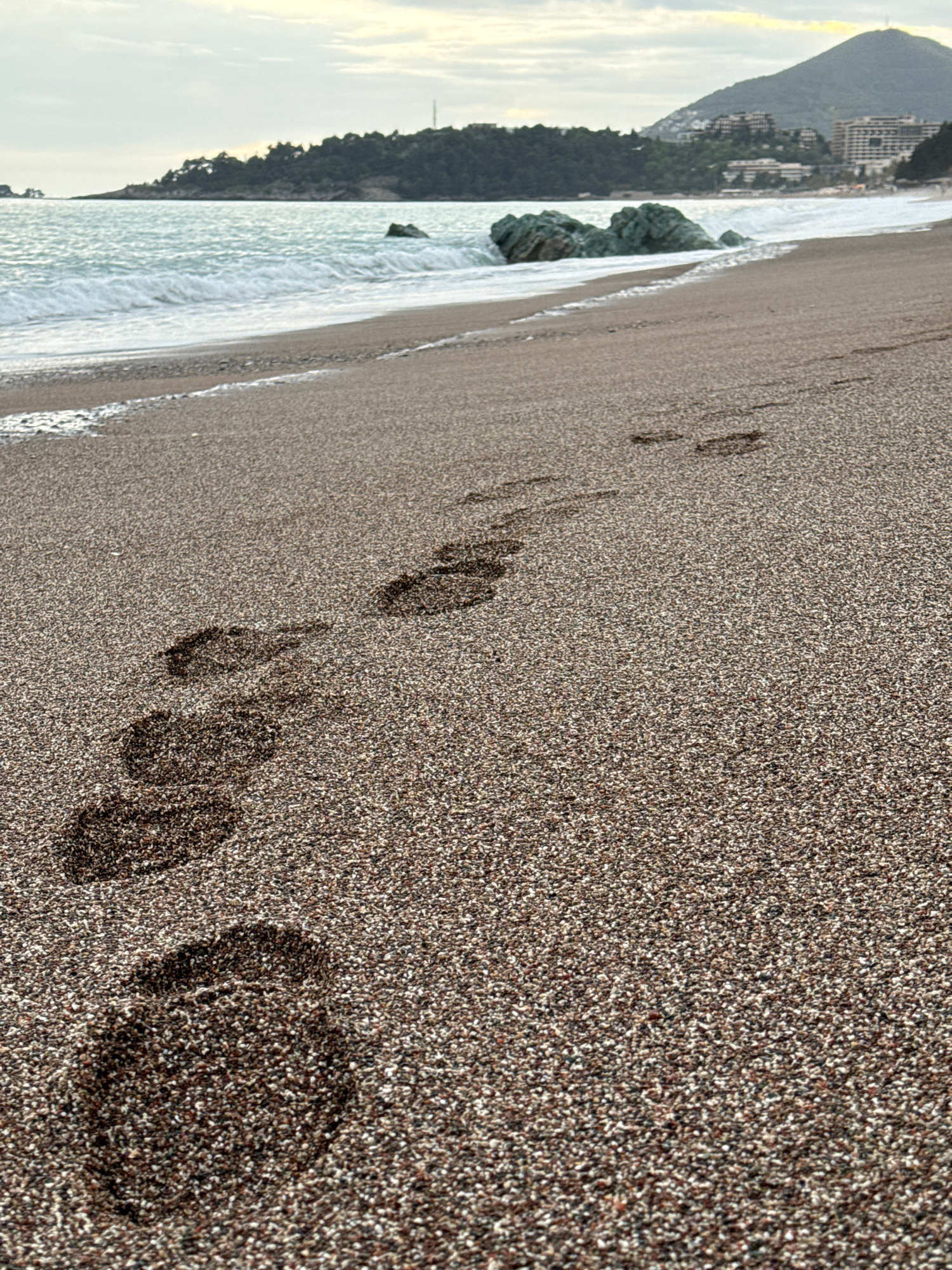 A landscape-oriented photograph depicts a beach with a line of footprints in the sand receding from the bottom right to the upper left of the frame. The beach appears to be composed of small pebbles o…read more