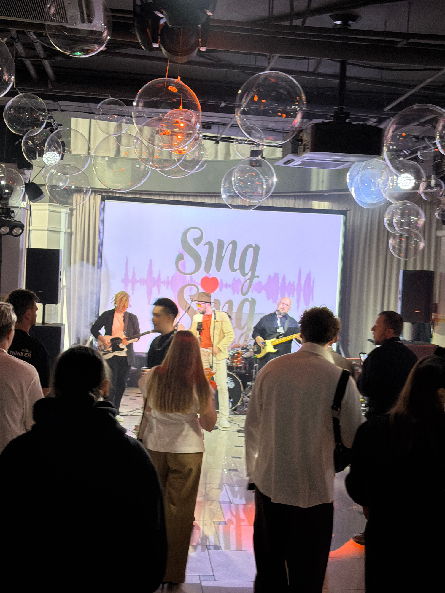 A gathering of people is occurring, seemingly at a venue in Perm, Russia. A band is performing on stage in front of a projected screen displaying a design that includes the word "Sing." Some in the au…read more