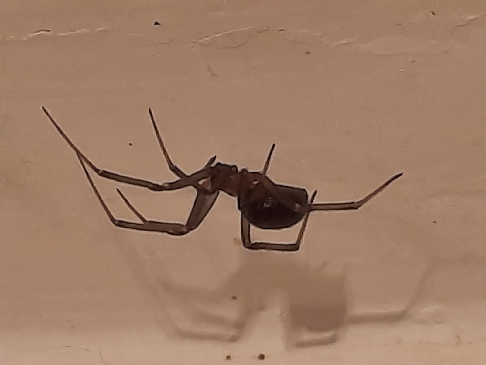 A brown spider is on a light brown surface. The spider has a dark, bulbous abdomen and long, slender legs. A shadow of the spider is visible on the surface. The location in the city of Архангельское,…read more