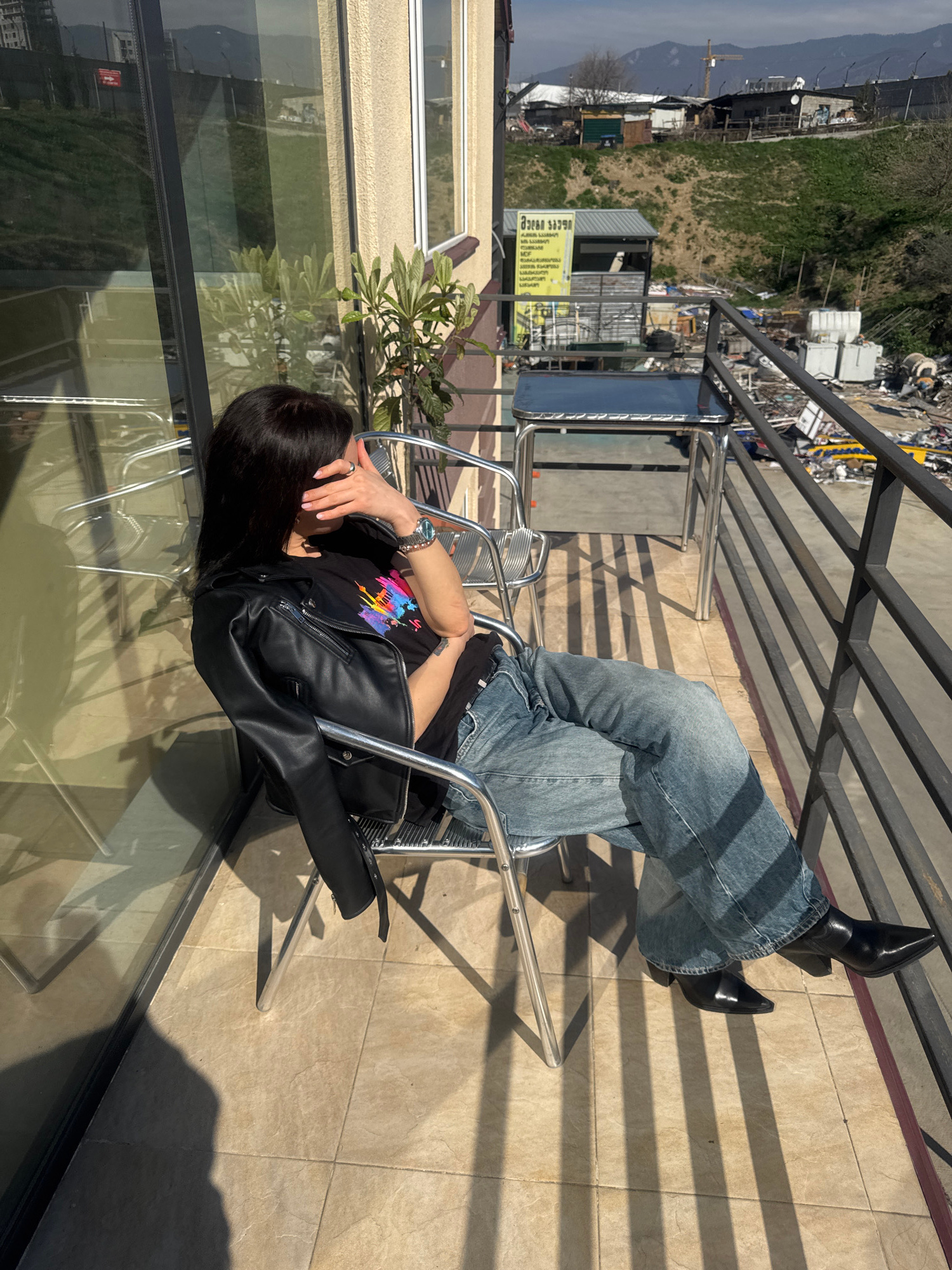 The image shows a woman lying in a metal chair on a balcony. She is wearing blue jeans, a black t-shirt with a colorful design, a black leather jacket, and black pointy-toe boots. Her face is partiall…read more