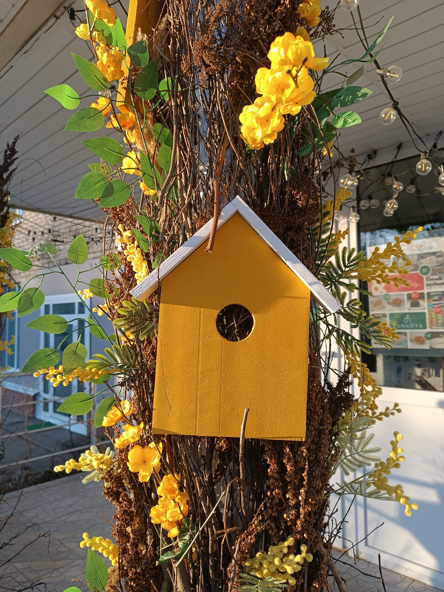 A vibrant yellow birdhouse with a white roof hangs centrally from a thick, dark brown post, which is extensively decorated with artificial greenery. The post is covered in entwined dried twigs and dar…read more