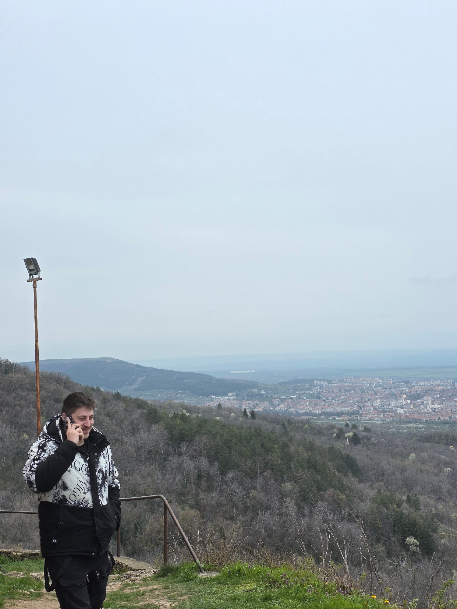 A man is talking on the phone on a scenic overlook in Unknown, Unknown. He is standing on a dirt path with a metal railing, with a view of the city below. The sky is overcast. He is wearing a black ja…read more