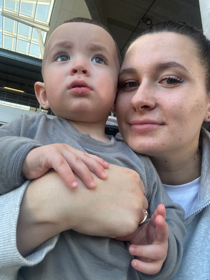 A mother and child are captured in a close-up shot. The mother, wearing a gray hoodie, is looking at the camera with a soft expression. The child, dressed in a gray long-sleeved shirt, is nestled agai…read more