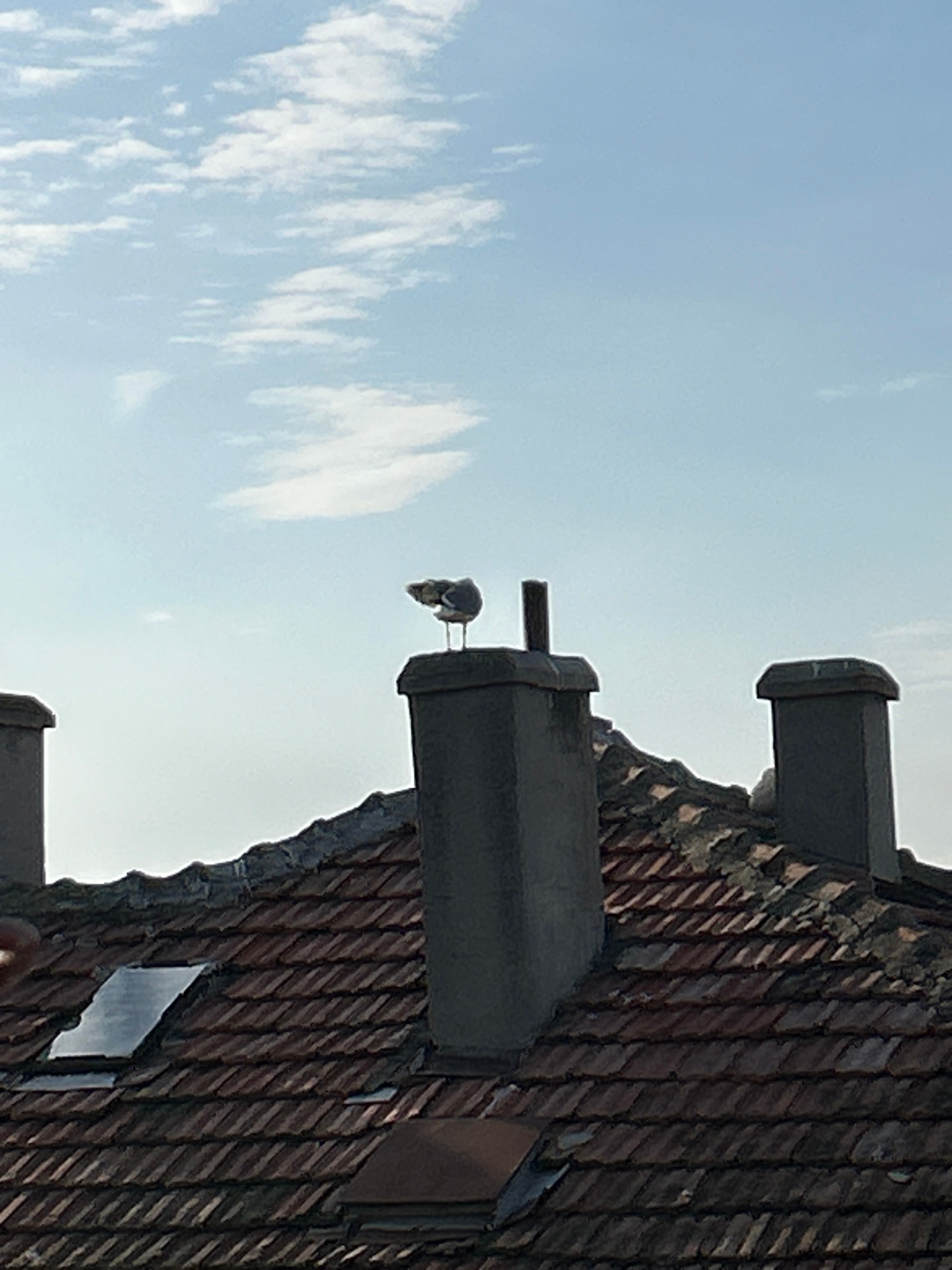 A low-angle, daylight shot shows a section of a building's roof with red tiles and several chimney stacks. Two birds are perched on the horizontal metal bar extending from the middle chimney stack. Th…read more