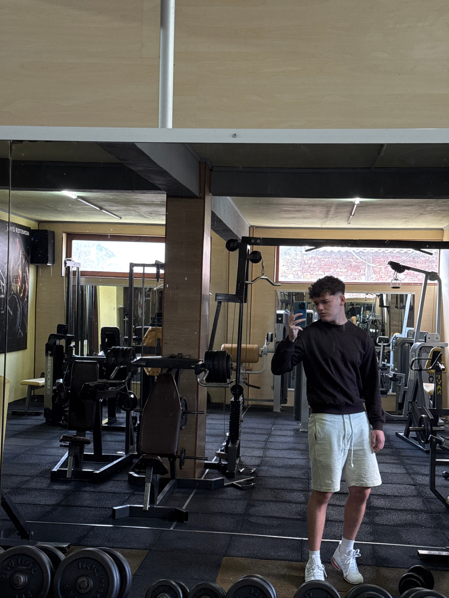 A young man is standing in a gym in Goce Delcev, Bulgaria, reflected in a mirror. He is wearing a black long-sleeved shirt, light-colored shorts, and white sneakers. He is holding a smartphone and app…read more