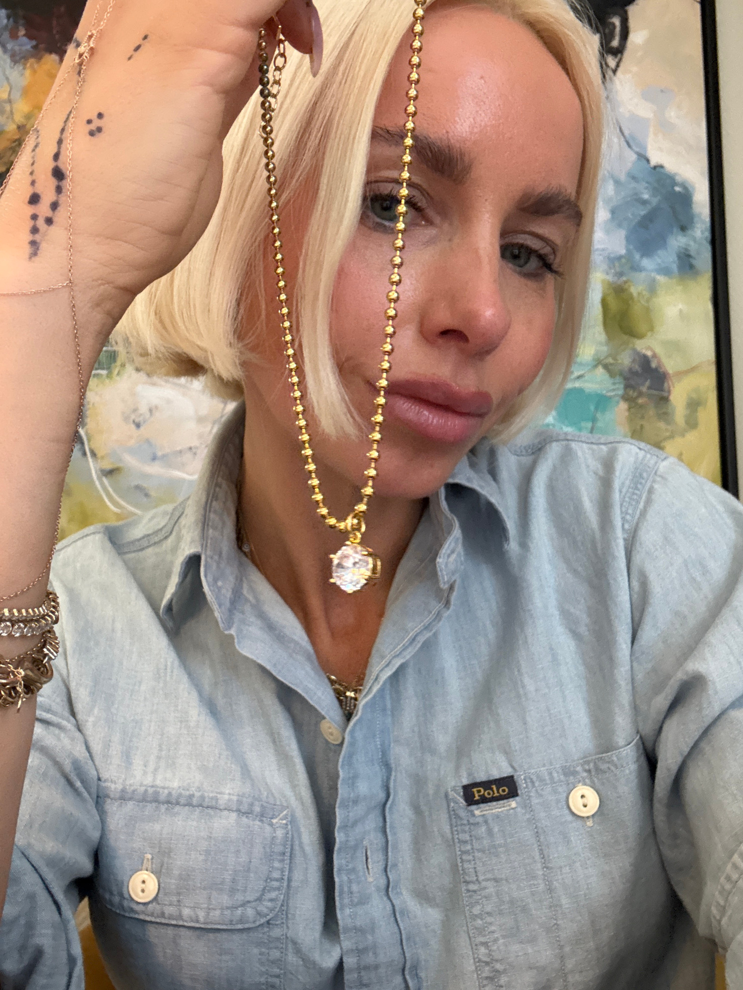 A fair-skinned blonde woman is photographed at close range, possibly indoors. She is wearing a light blue, button-down shirt with a "Polo" logo visible on the pocket. She is holding a gold beaded neck…read more