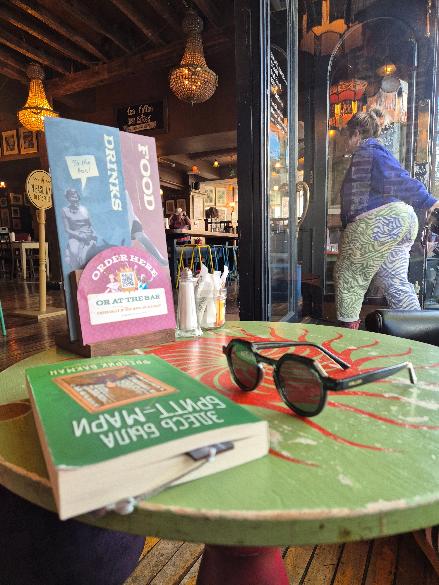 The image captures a view from within a building, likely a restaurant or cafe in West Suffolk, United Kingdom, focusing on a table with various objects. The table, painted green with a red sunburst de…read more