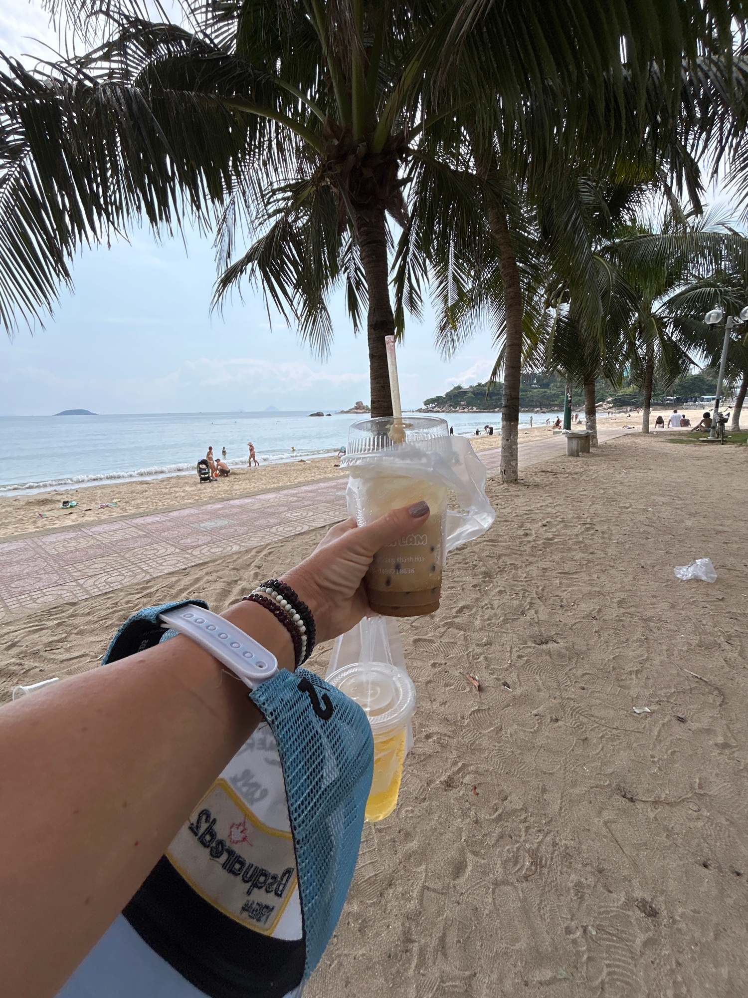 View from a beach in Bắc Nha Trang, Vietnam. The image appears to be a first-person view of an arm holding a beverage on a sunny day. The beach is visible in the background, along with palm trees, the…read more