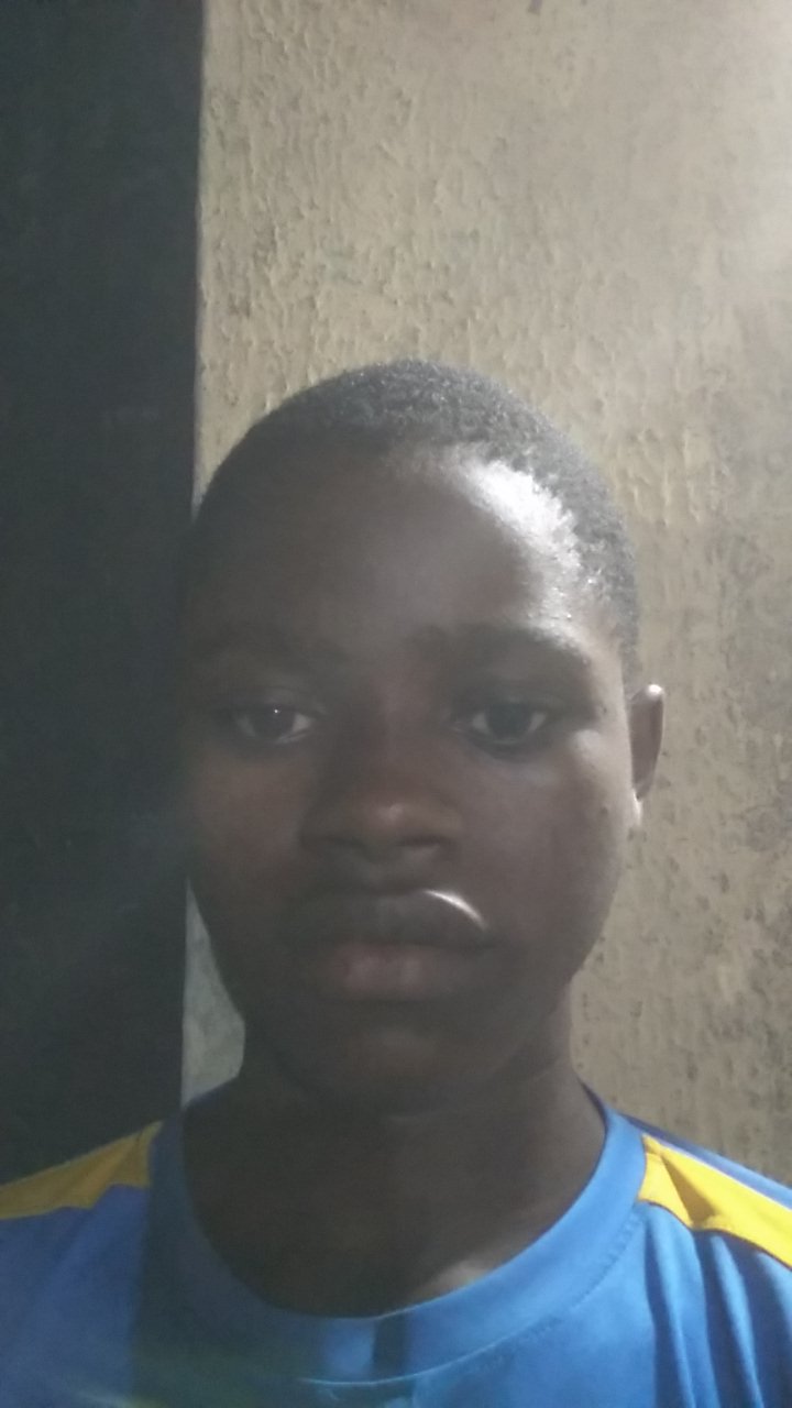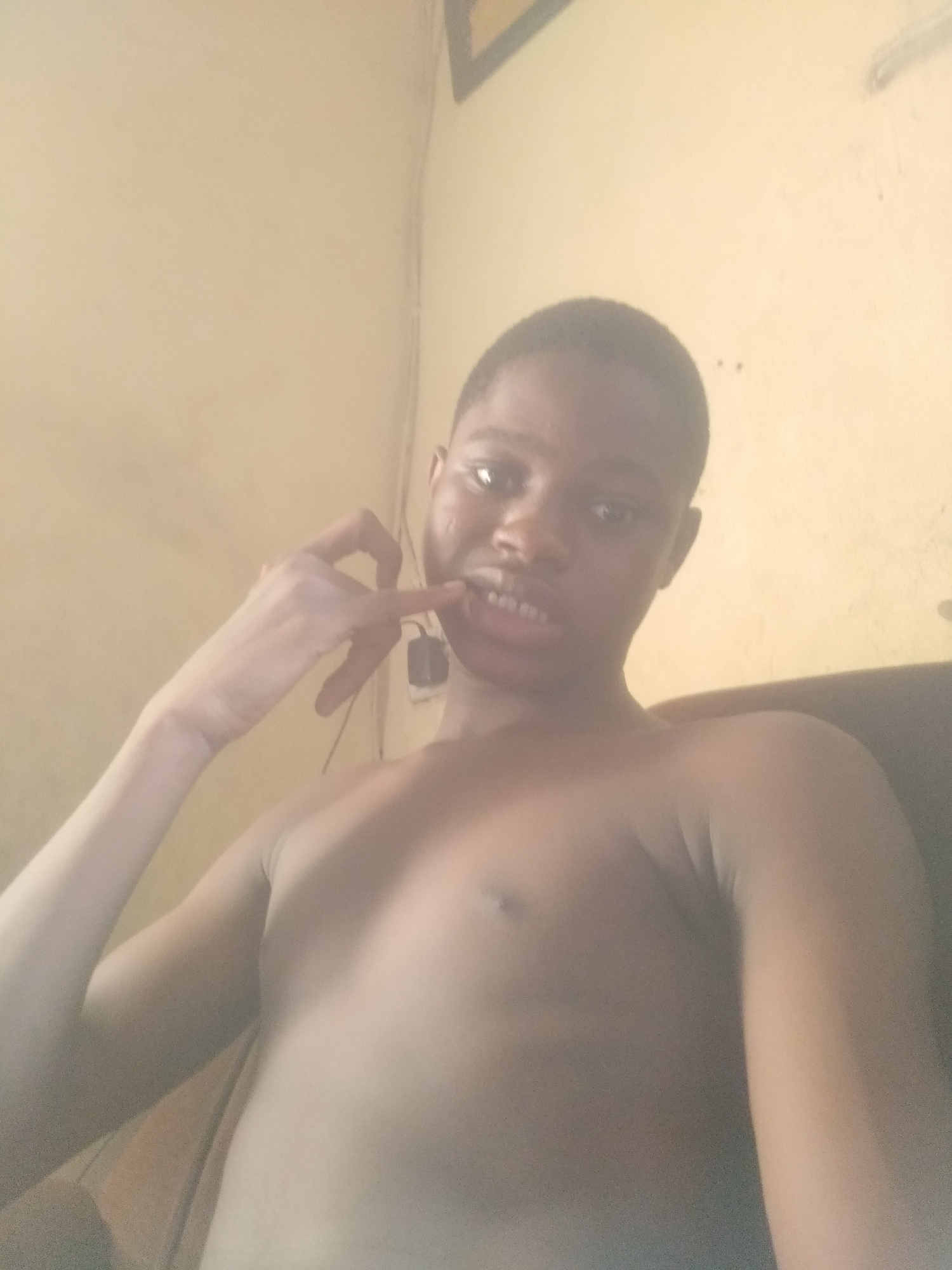 The image features a young individual, likely male, with dark skin and short, dark hair, captured in a close-up, chest-up shot. He is shirtless, revealing his upper torso and arms. The subject is look…read more
