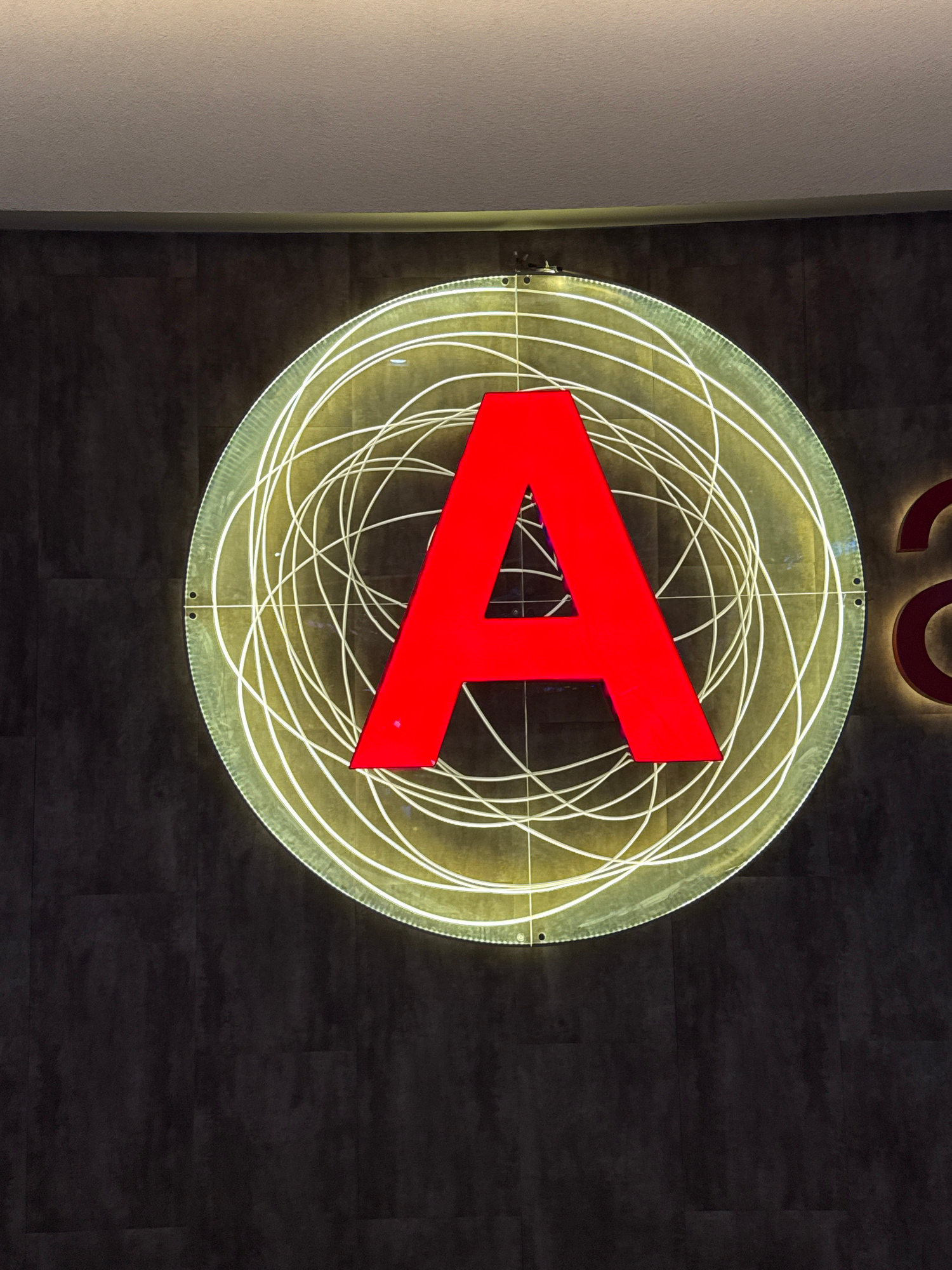 The image shows a circular logo mounted on a dark, textured wall, likely inside a building. The logo consists of a red stylized "A" shape inside a series of concentric, glowing white circles. The circ…read more