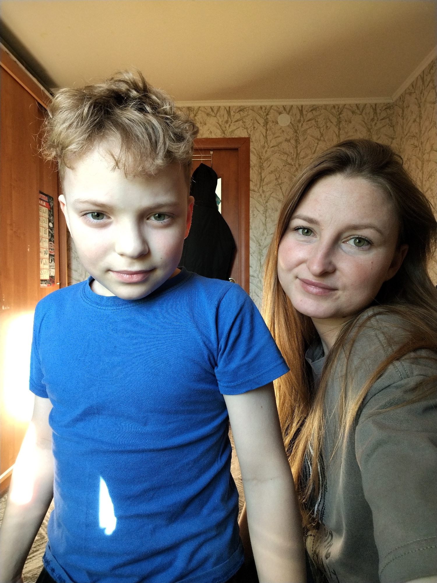 A waist-up shot features a young boy and a woman posing indoors. The boy stands slightly to the left, facing forward with a neutral expression. He has fair skin, short, curly blond hair, and light-col…read more