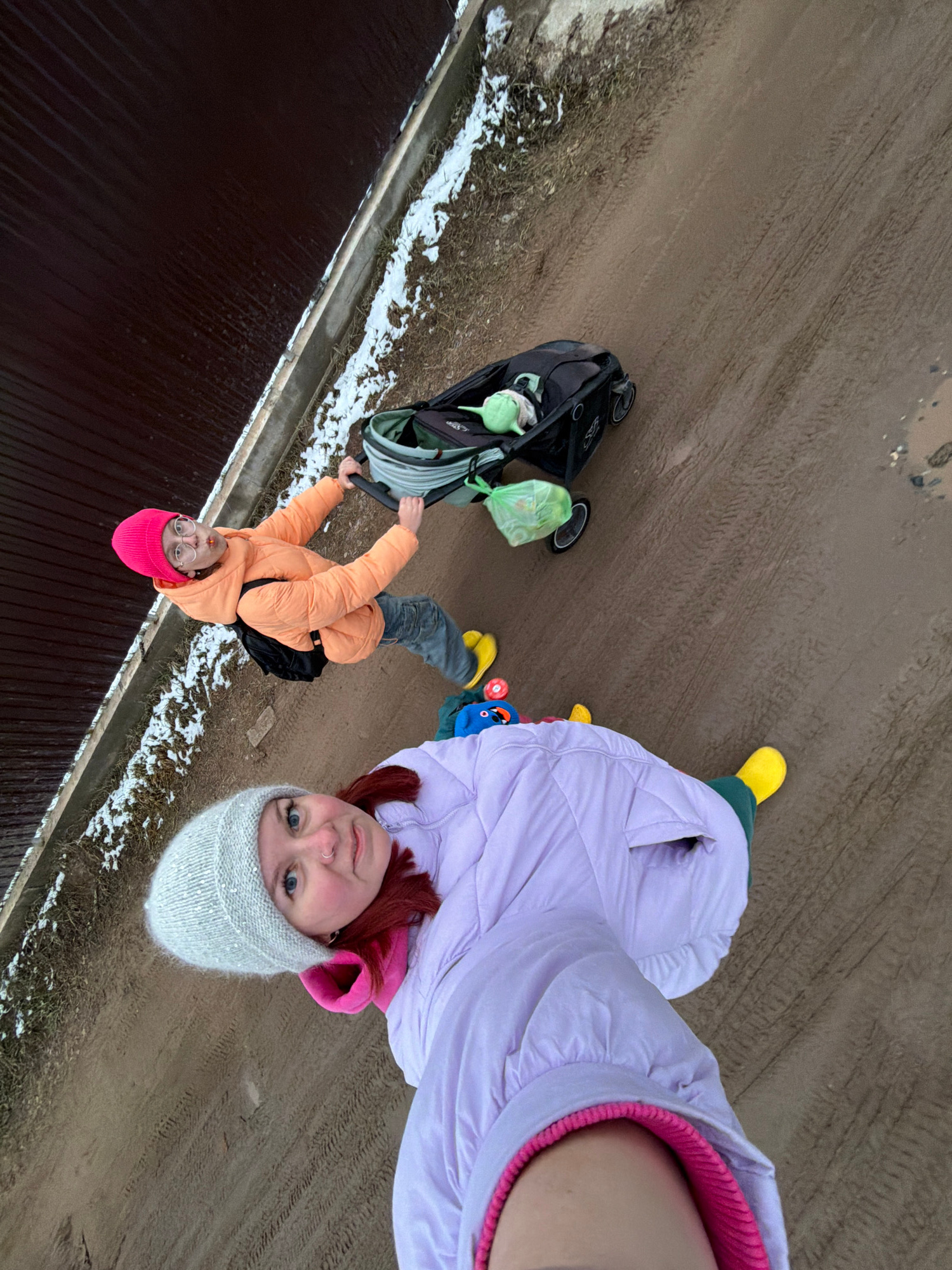 Two individuals stand on a muddy road in what appears to be a suburban area of Chaikovsky, Russia, as evidenced by the presence of snow, the architecture, and the type of road. The woman closer to the…read more
