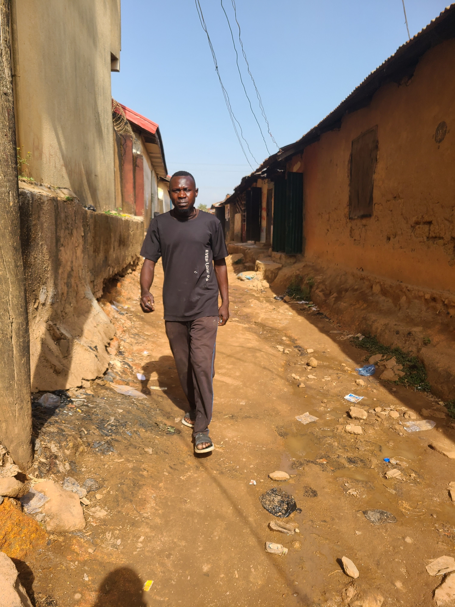 An outdoor, eye-level shot depicts an adult male standing in a narrow, unpaved alleyway or pathway in what appears to be a residential area. The image has been rotated and shows the man standing uprig…read more