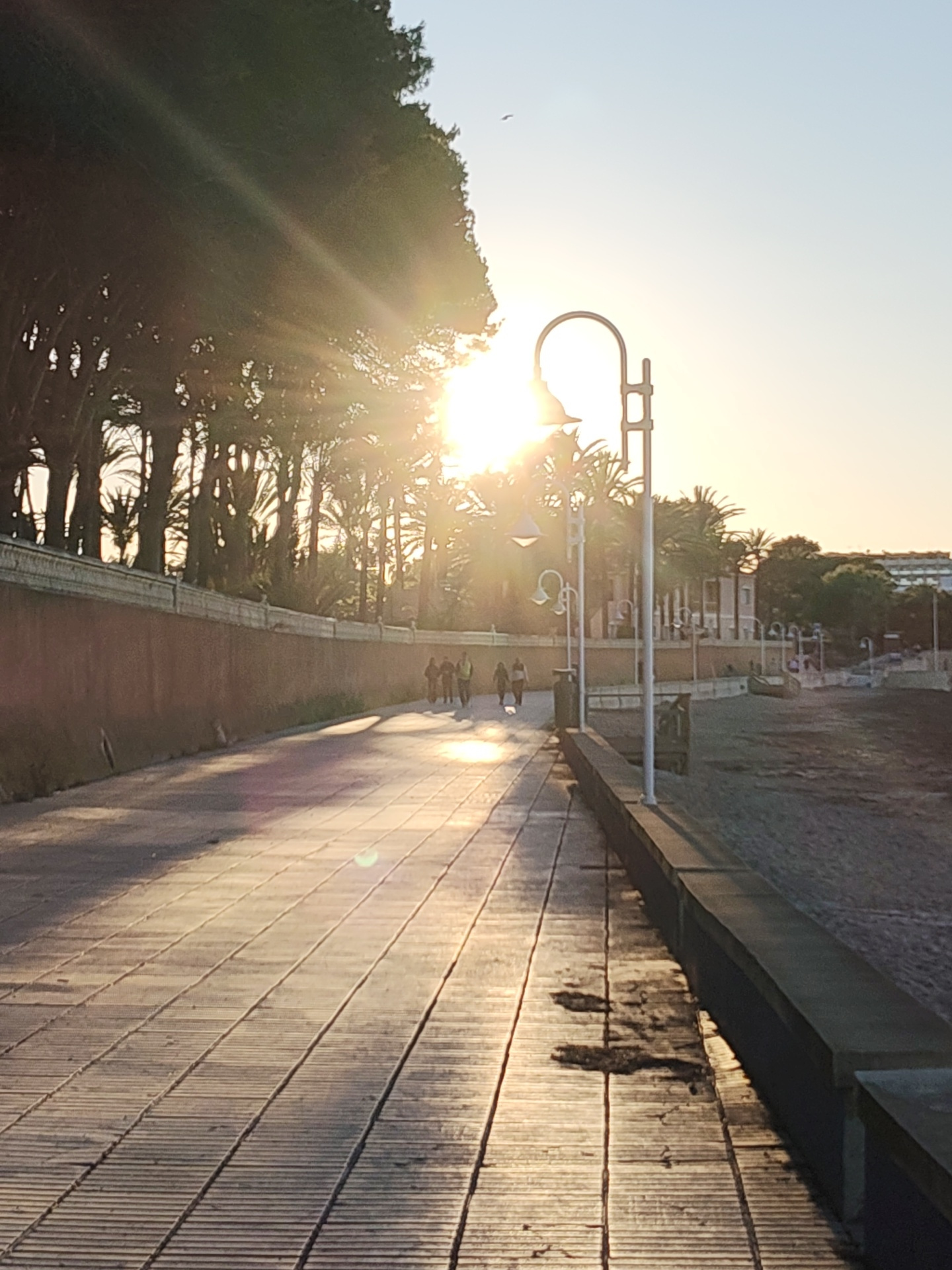 The image depicts a sun-drenched coastal promenade in Dénia, Spain, likely during sunrise or sunset. The sun, a bright white and yellow orb, is low in the sky on the upper left, partially obscured by…read more
