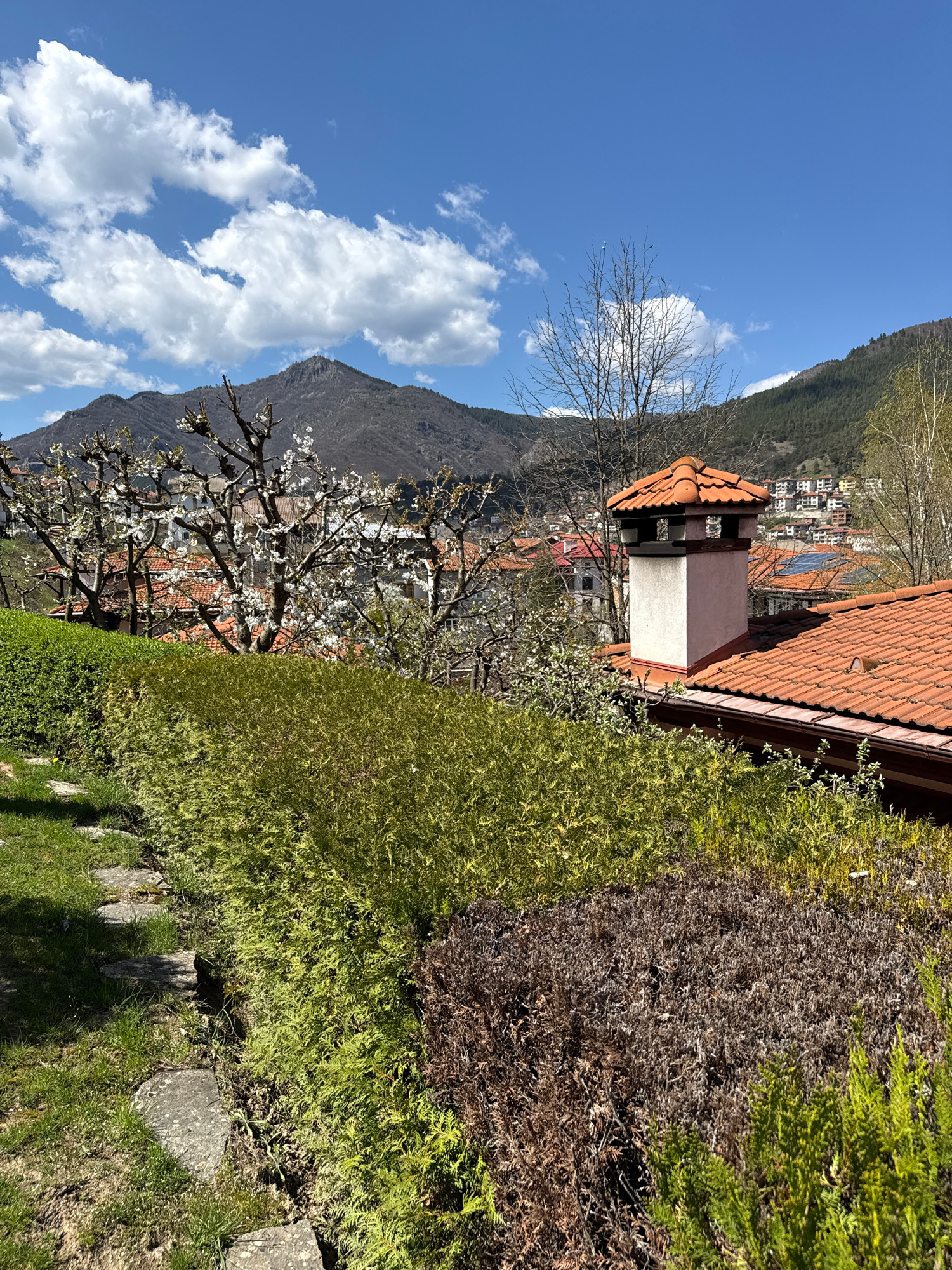 The image shows a landscape scene in Devin, Bulgaria, featuring a view towards a mountain. In the foreground, there are various bushes, some green and some brown. A tree with white blossoms is visible…read more