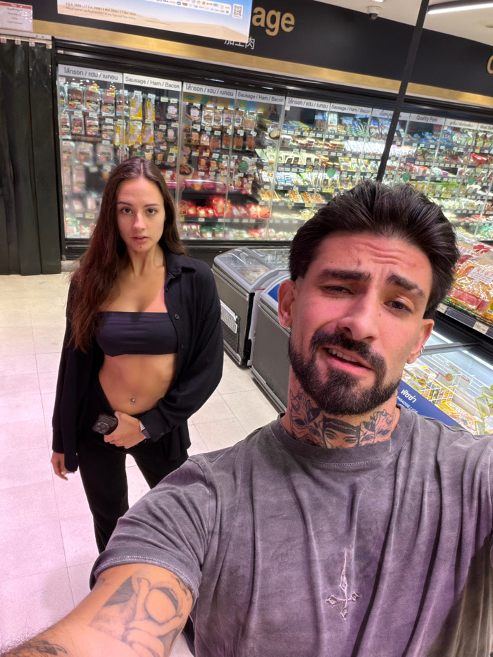This image depicts a selfie taken by two individuals inside a supermarket meat section in Bangkok, Thailand. **Scene Overview:** The foreground is occupied by a male and female subject, with refriger…read more