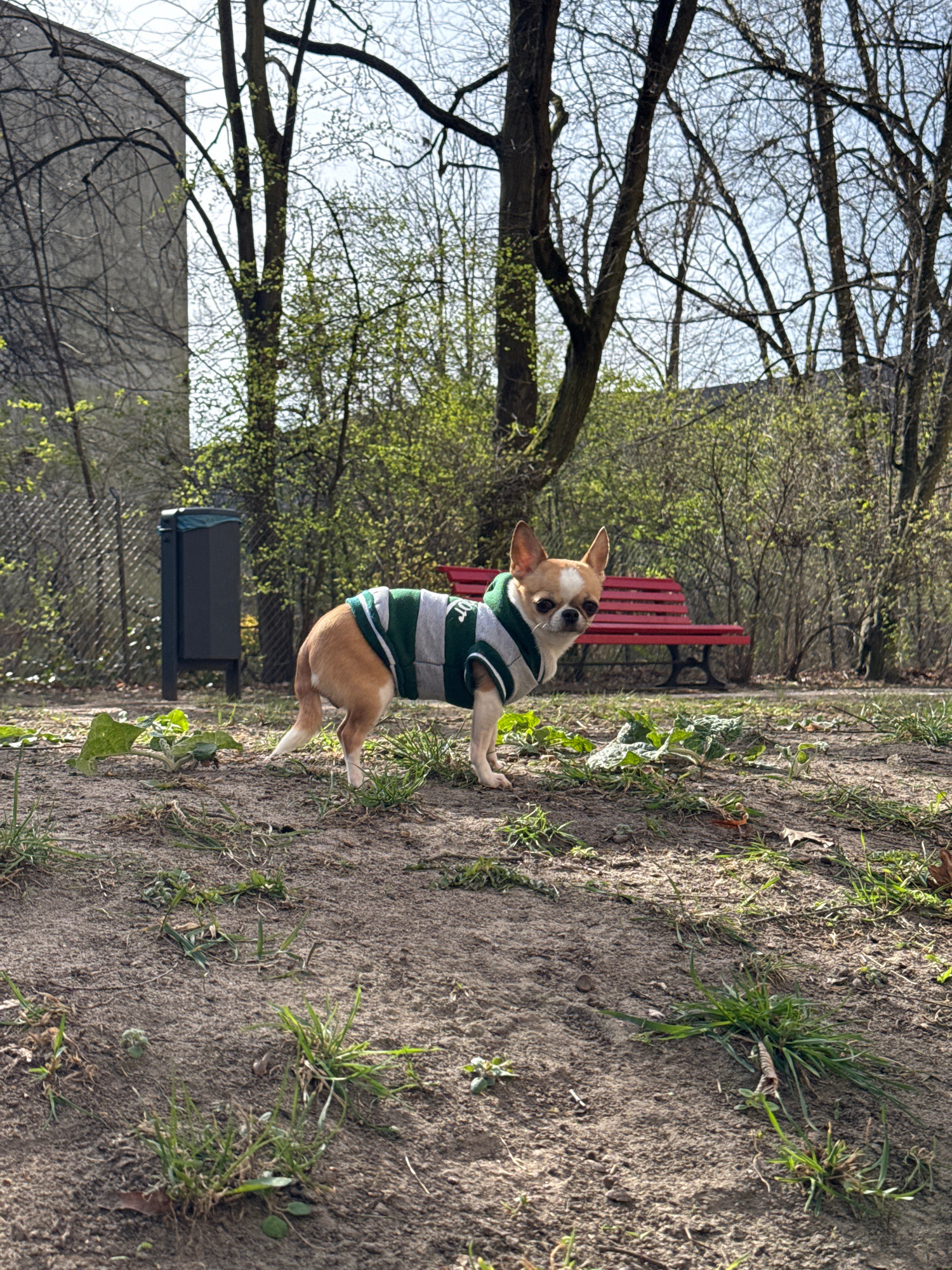 A fawn and white Chihuahua, wearing a green and grey striped hooded sweater, stands in the lower center of the frame on sparsely vegetated, sandy ground within an urban park. The dog faces slightly leβ¦read more