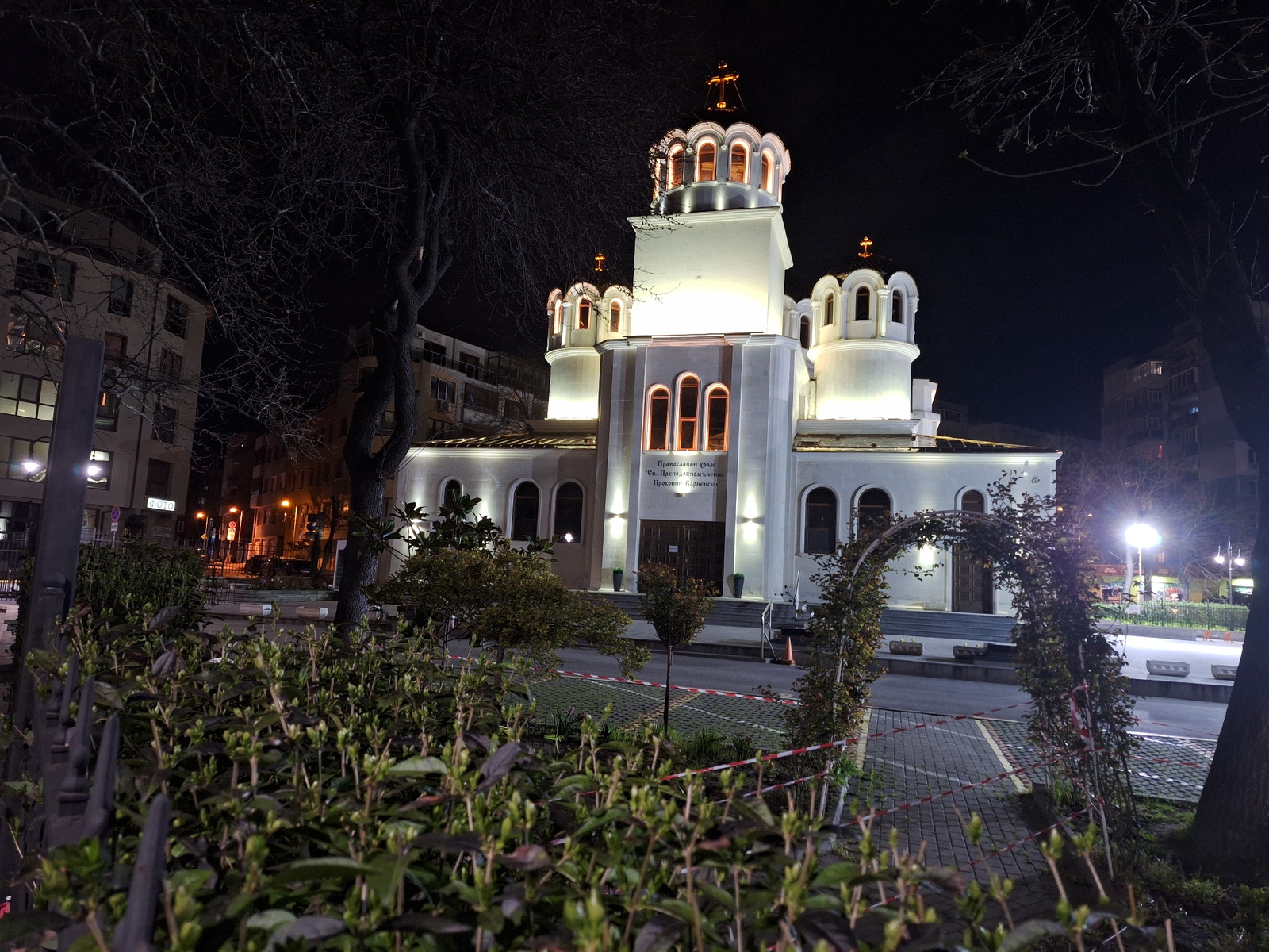 At night, the Sveti Prokopiy Varnenski Church in Varna, Bulgaria, is brightly illuminated against the dark sky. The white building, with its distinctive onion domes topped with golden crosses, is the…read more