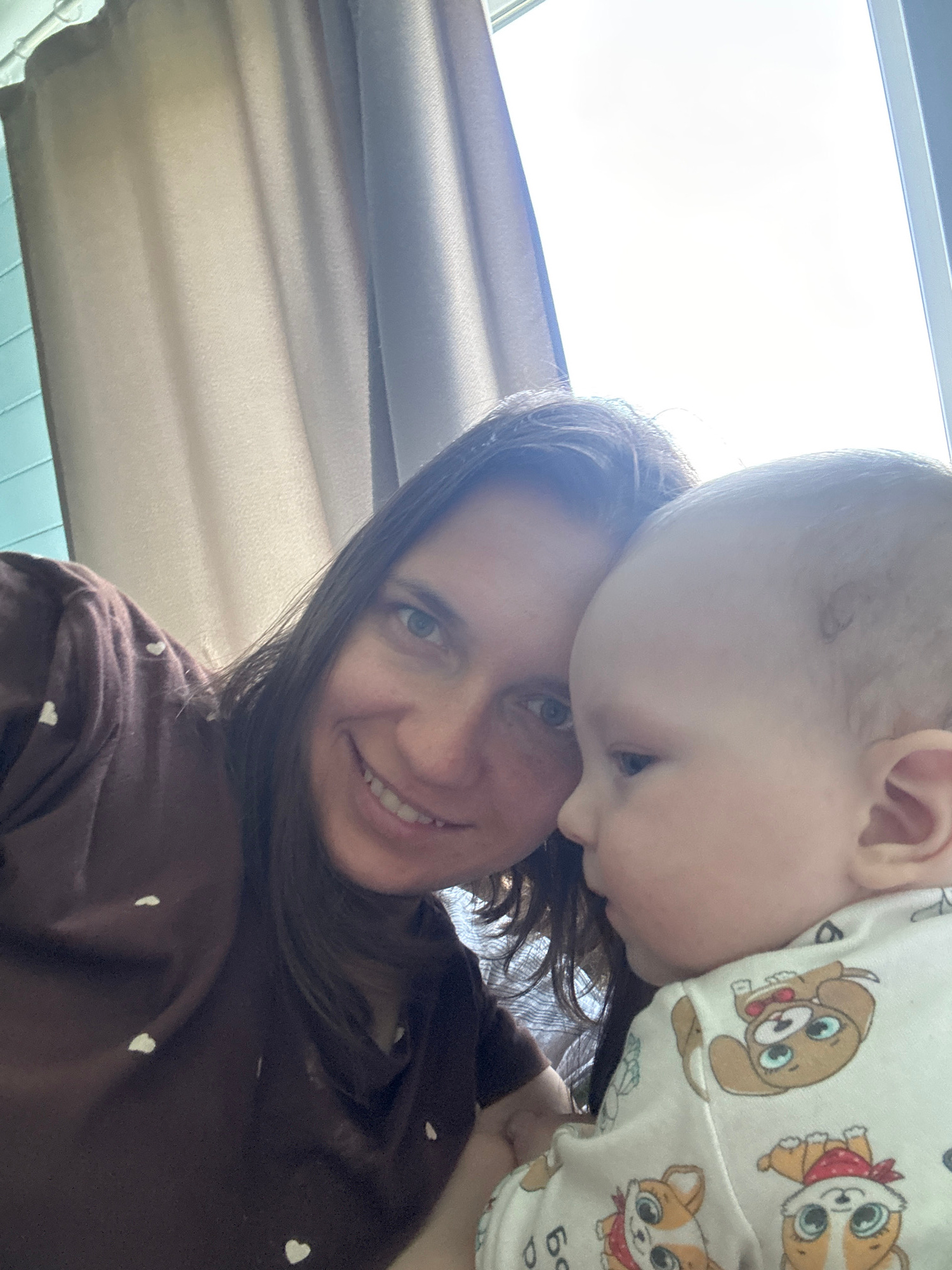 This is a close-up, angled selfie featuring an adult woman and a baby, capturing a tender moment between them. The woman, positioned in the lower right half of the frame, has long dark hair and light…read more