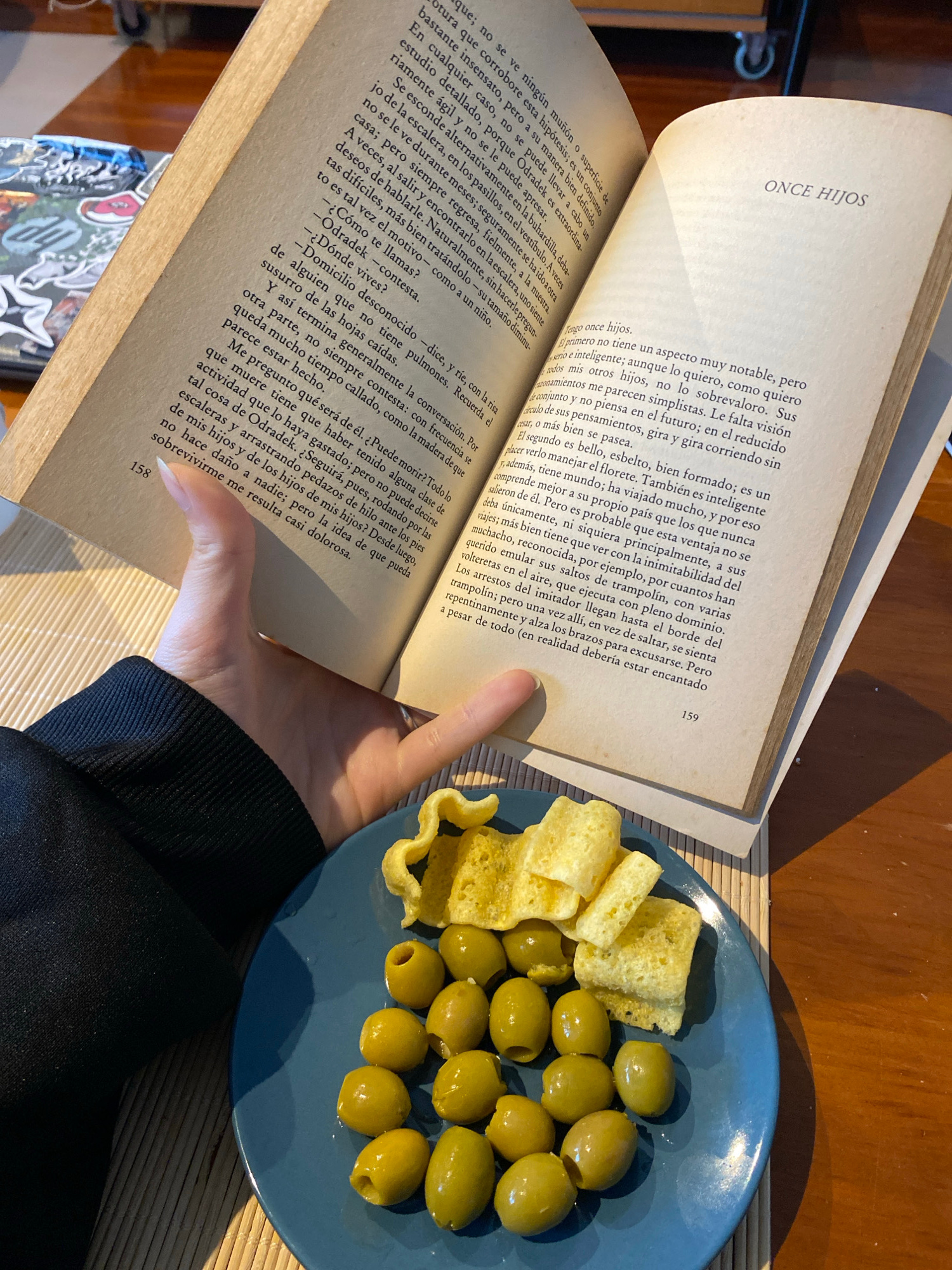 A person is holding open a book titled "ONCE HIJOS" (Eleven Sons), written in Spanish. The left page is numbered "158", and the right page is numbered "159". Next to the book, on a light blue plate, a…read more