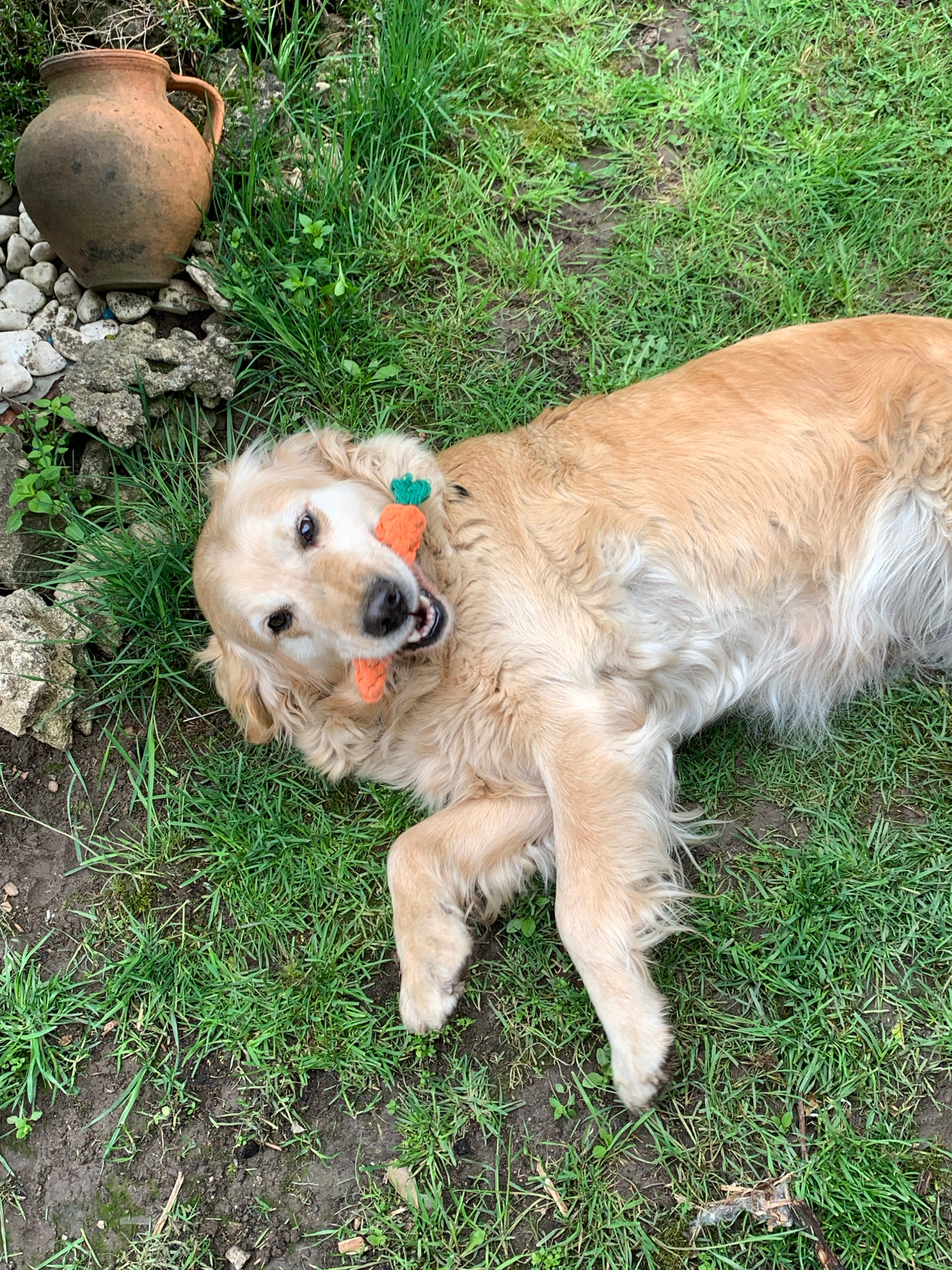 A Golden Retriever dog lies on its back in a grassy area. The dog holds an orange toy in its mouth. An earthenware pot sits to the left of the dog, near some stones. The background includes grass and…read more