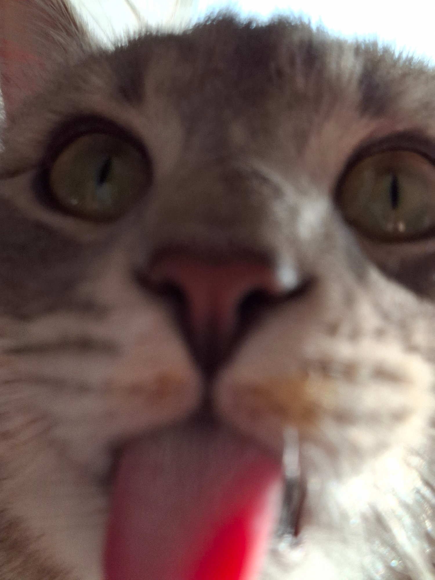 The image is a close-up, blurry shot of a gray and white tabby cat. The cat's face is close to the camera, with its green eyes and pink nose prominently visible. Its pink tongue is sticking out to theβ¦read more