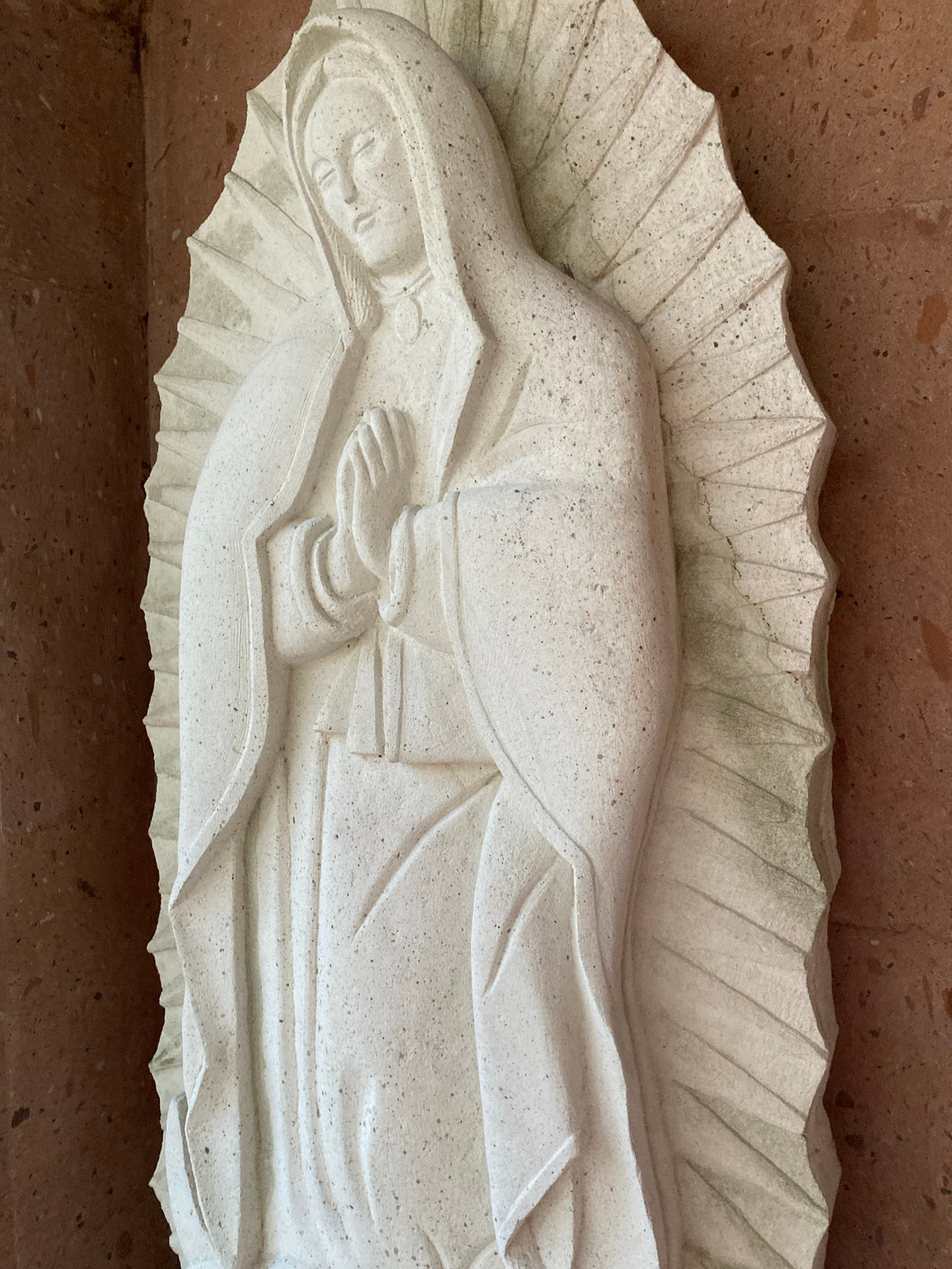 A close-up, high-angle shot captures a white stone sculpture of the Virgin Mary. The sculpture is set against a reddish-brown speckled background. Mary is depicted lying down, enveloped by a scalloped…read more