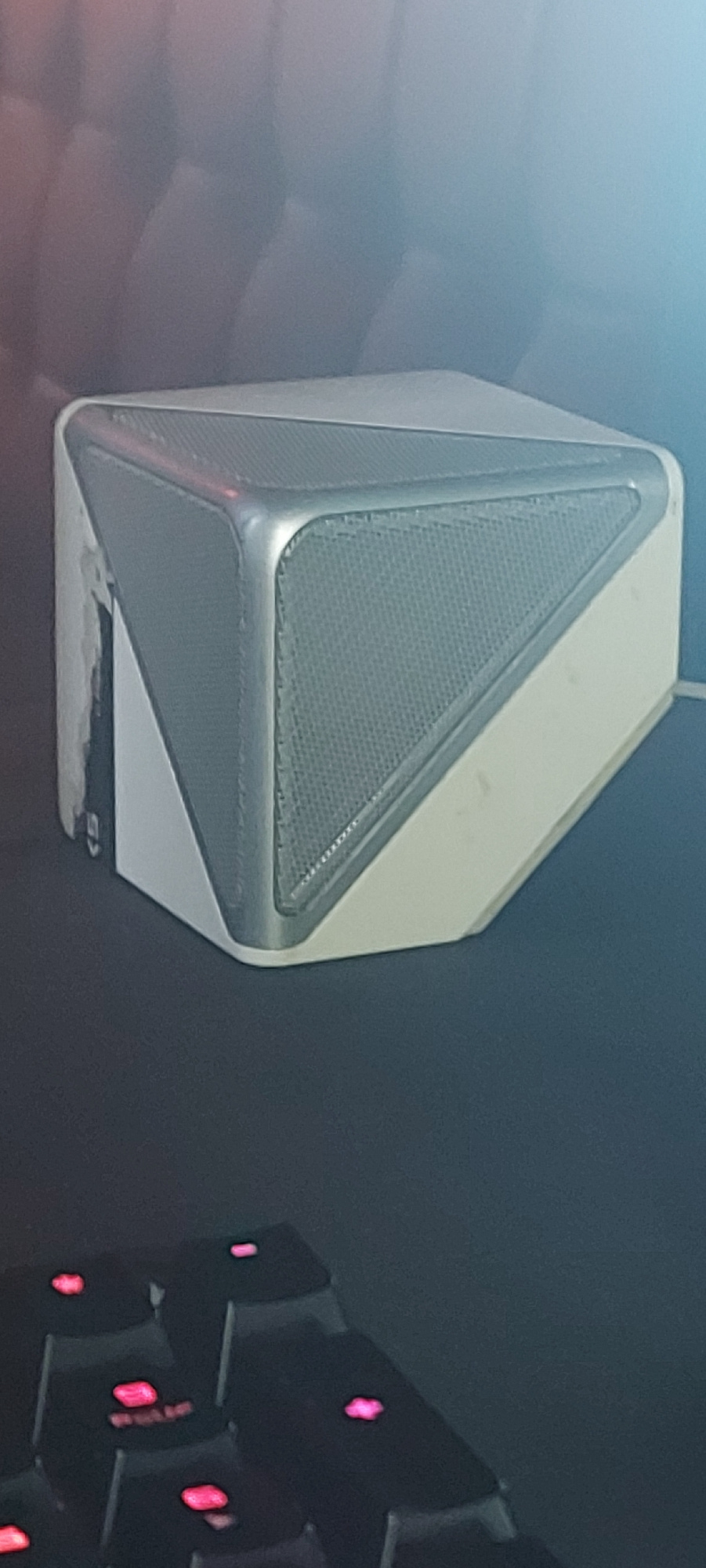 The image shows a white and gray speaker with a triangular mesh front. The speaker appears to be sitting on a dark surface, likely a desk or table. A portion of a keyboard with red-lit keys is visible…read more