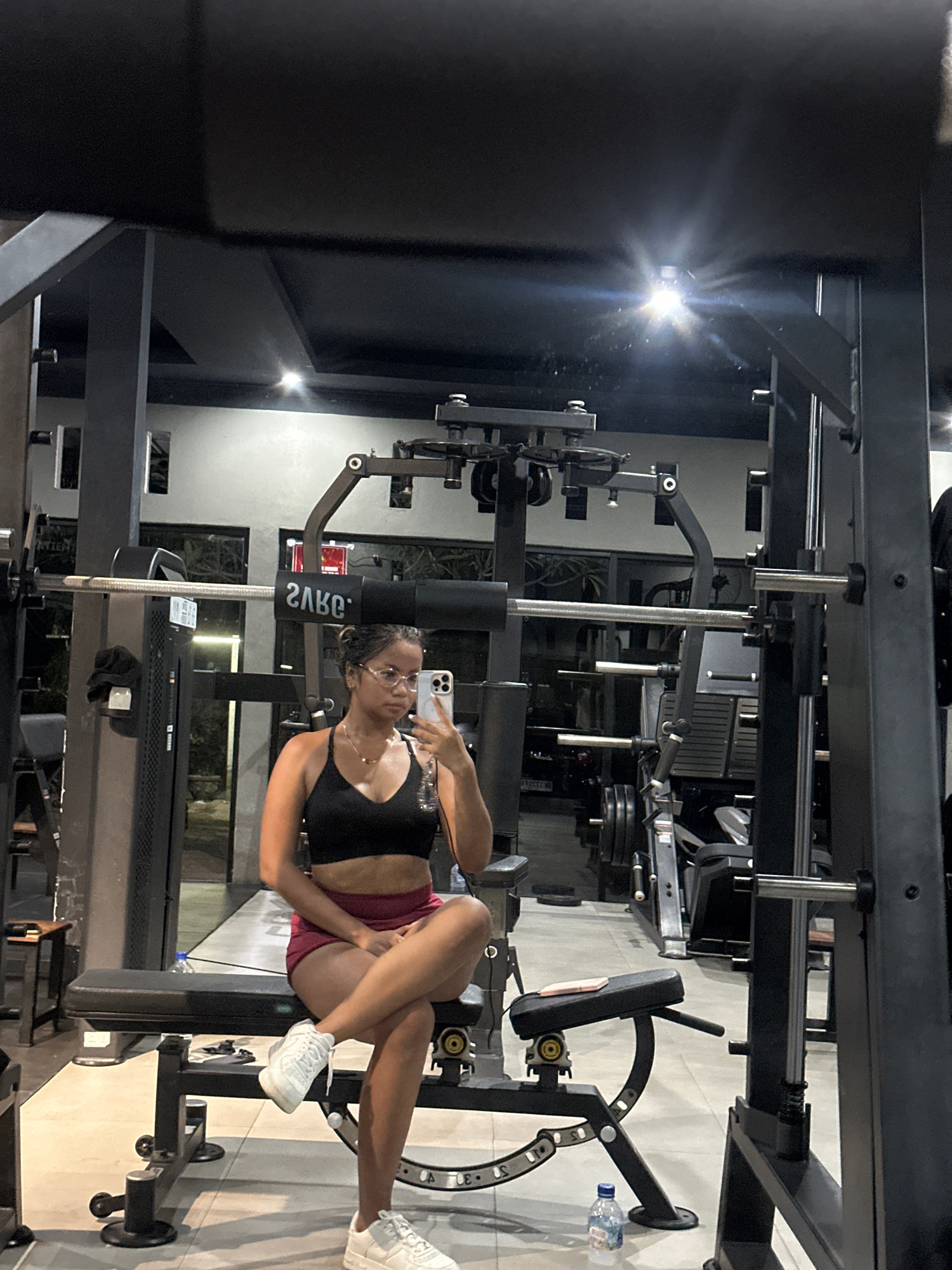 A woman wearing a black crop top, burgundy shorts, and white sneakers takes a selfie with her smartphone in a gym located in Batubulan, Indonesia. The gym features various weightlifting machines inclu…read more