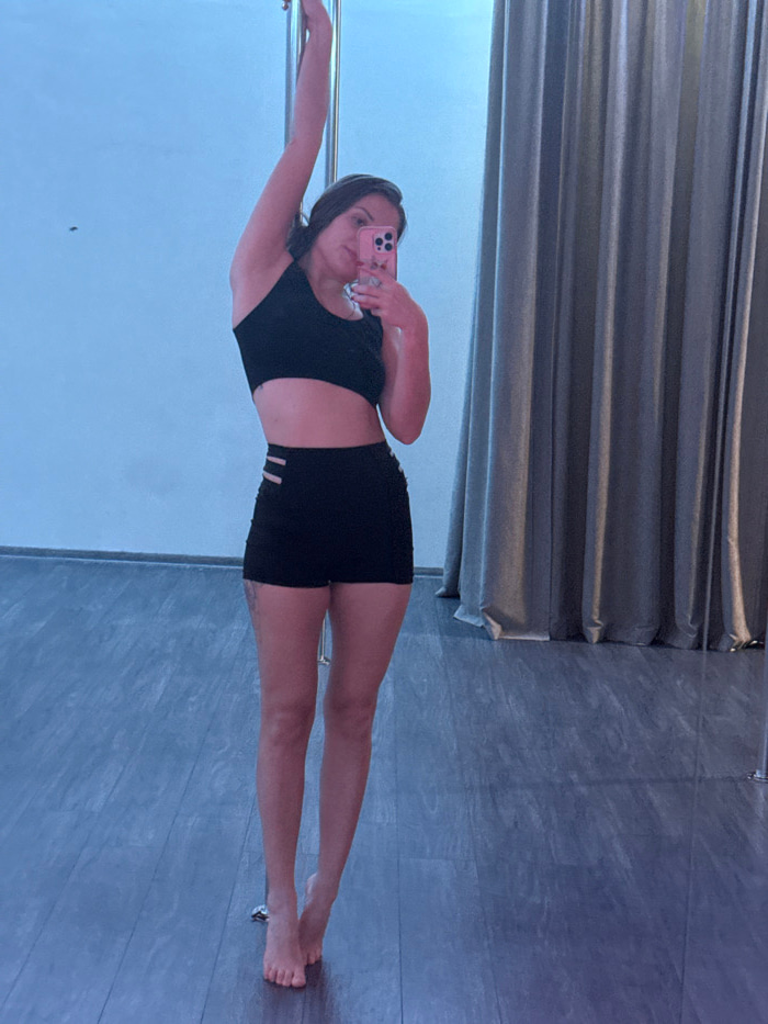 A woman is posing with one arm extended towards a pole, looking into her phone as she snaps a selfie. She is wearing a black sports bra and shorts. The background features curtains along the top edge…read more