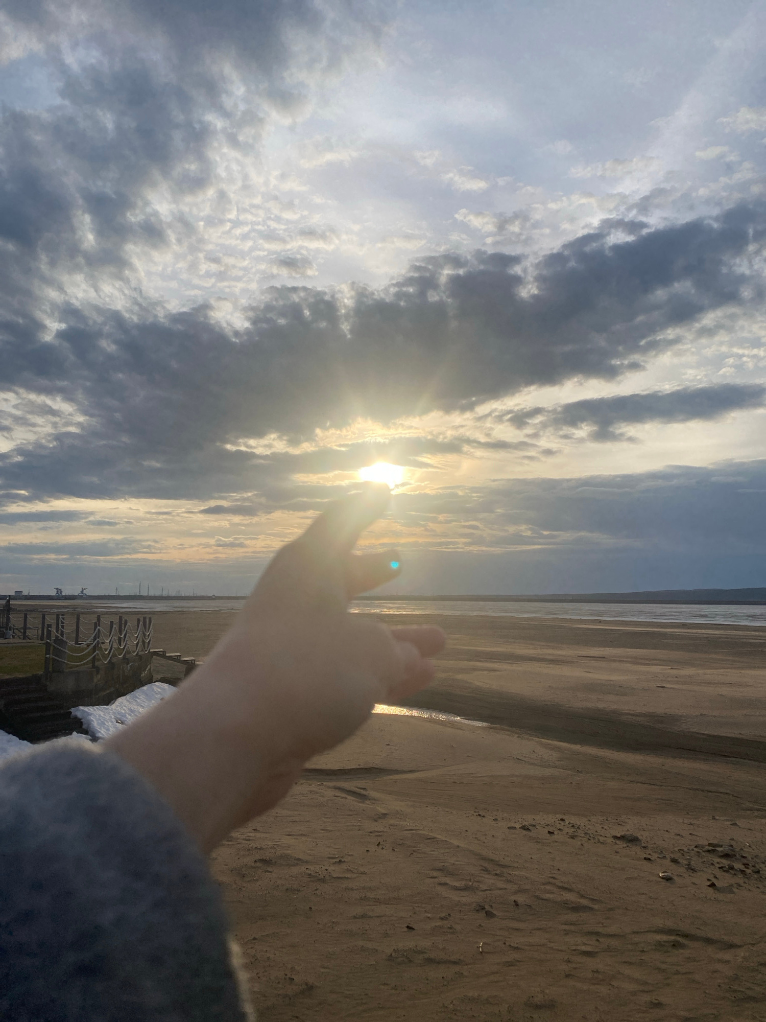 The image captures a beach scene in what appears to be Chaikovsky, Russia, given the context. The sky dominates the view, filled with a mix of cloudy patches and clear sections, with the sun breaking…read more