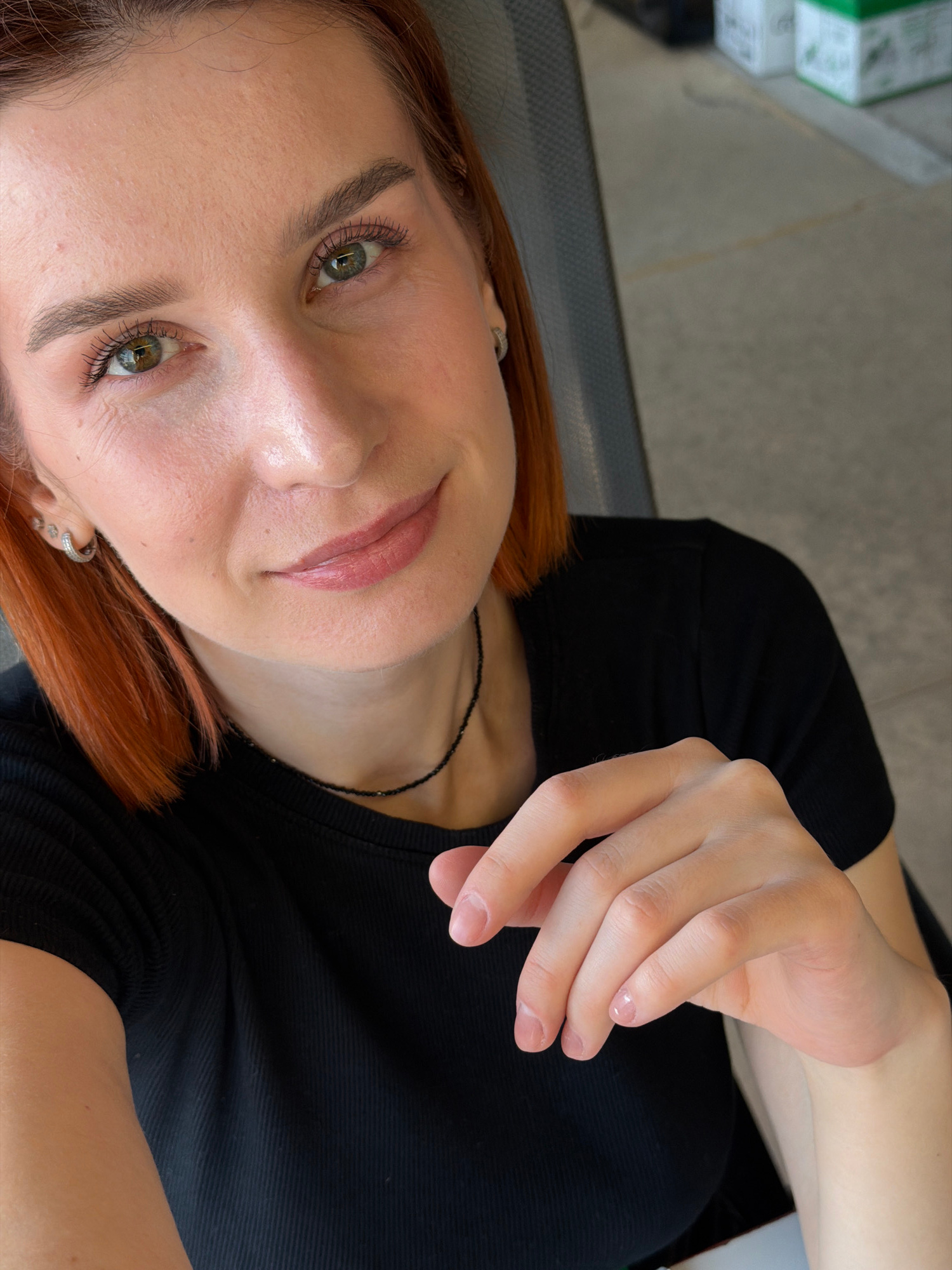 The image depicts a woman with red hair and fair skin. She has green eyes and is wearing a black top. Her hand is raised near her face. The background is blurry and appears to be an interior space. Th…read more