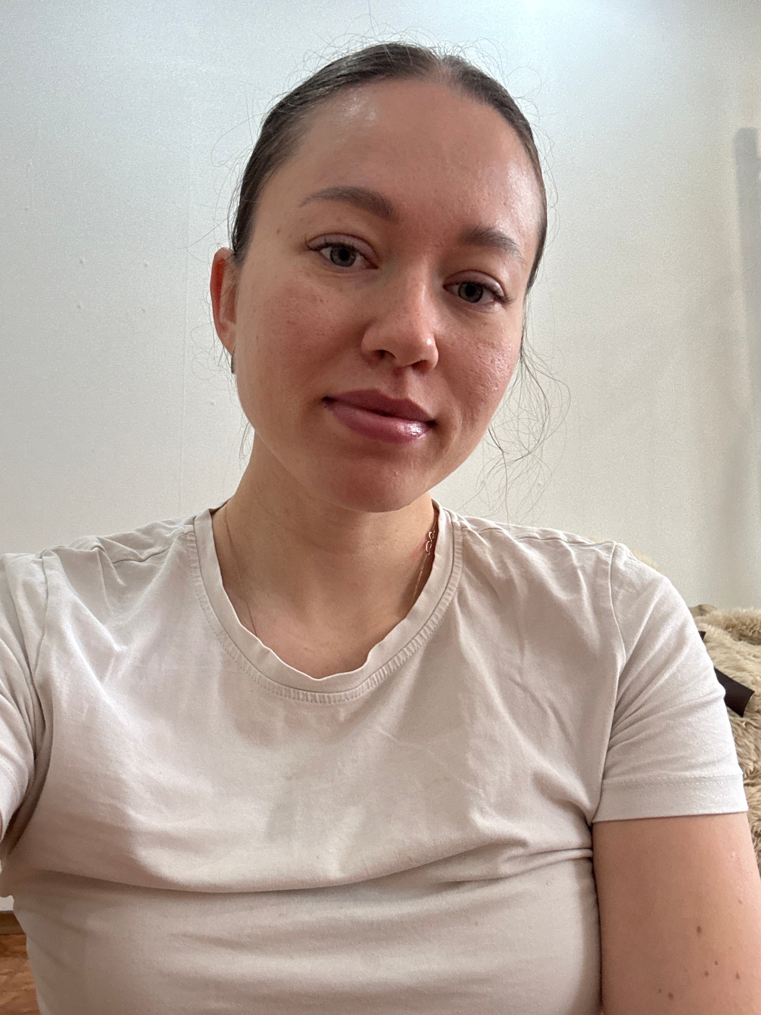 A woman with fair skin, dark hair pulled back, and a neutral expression faces the camera. She is wearing a light-colored T-shirt and a delicate necklace. The background is a plain white wall. No infor…read more
