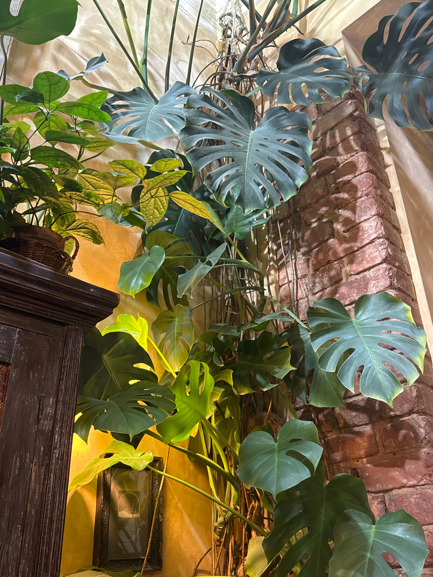 The image depicts an indoor scene with a lush array of plants, primarily Monstera deliciosa, cascading from above. The setting features a brick archway, suggesting a building with historical architect…read more