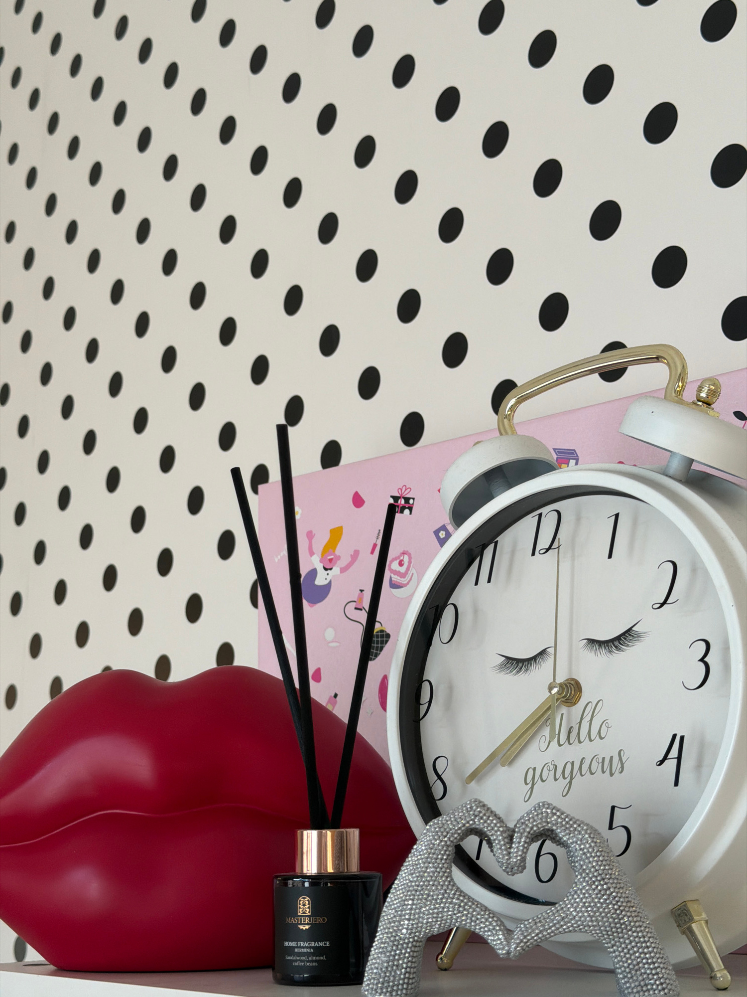 The image shows a still life composition, likely arranged for a photograph. The background is a white surface with a repeating pattern of black polka dots. Dominating the scene is a white alarm clock…read more