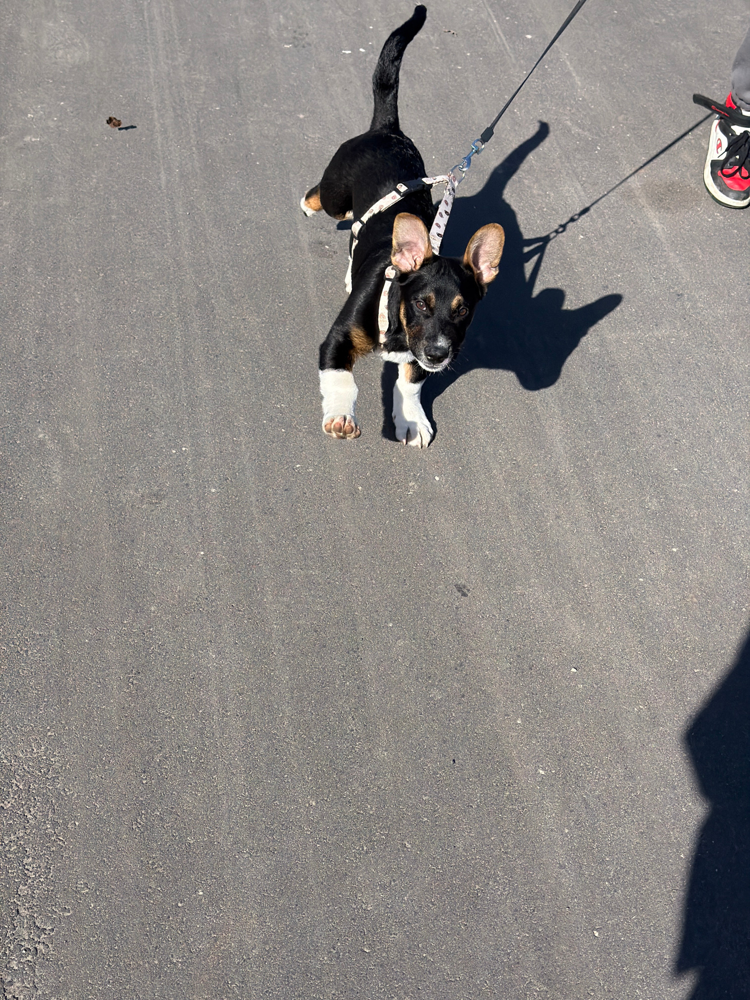 An aerial view shows a black and brown puppy with white paws on a gray asphalt surface, leashed to a person whose lower legs and red-accented shoe are visible at the top left. The dog is pulling forwa…read more