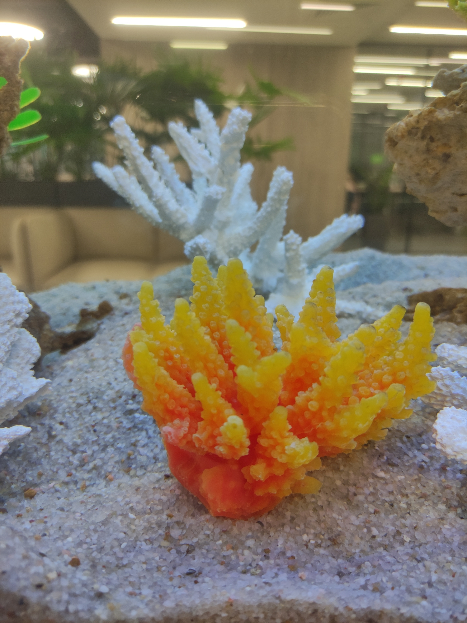 The image depicts a close-up of an aquarium interior. Artificial coral, colored orange and yellow, is positioned next to a white, branching coral replica on a bed of fine, light-colored sand. In the b…read more