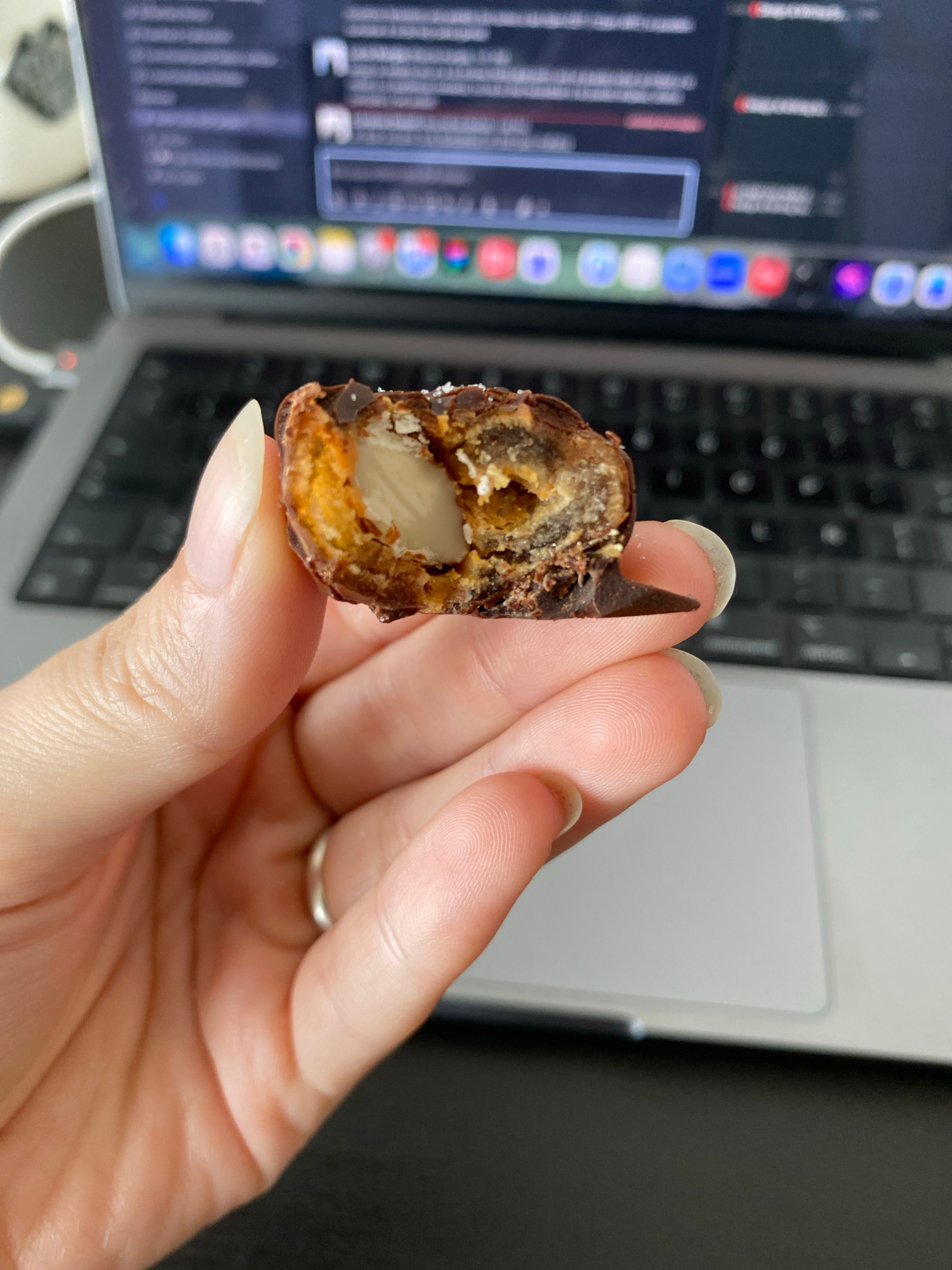 A close-up, high-angle shot captures a person's hand holding a half-eaten snack in the foreground, with a laptop in the blurred background. The hand, likely female, has well-maintained nails with a na…read more