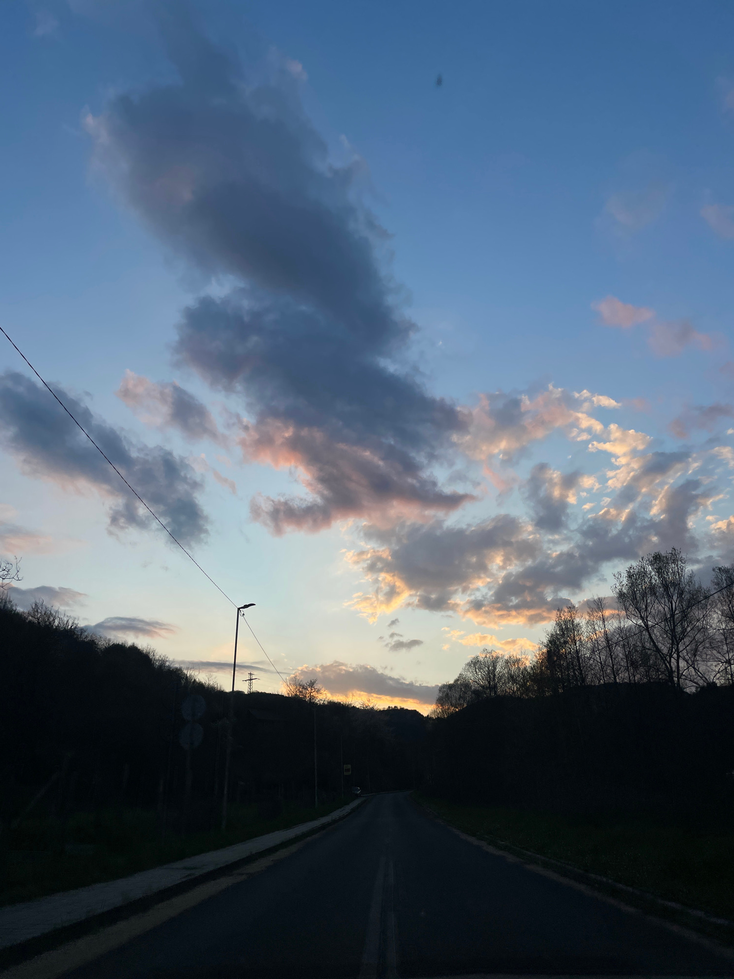 The image shows a road running through a landscape near Zlatograd, Bulgaria, at dusk or dawn. The road is paved and has a double yellow line. On one side of the road, there is a densely wooded area. A…read more