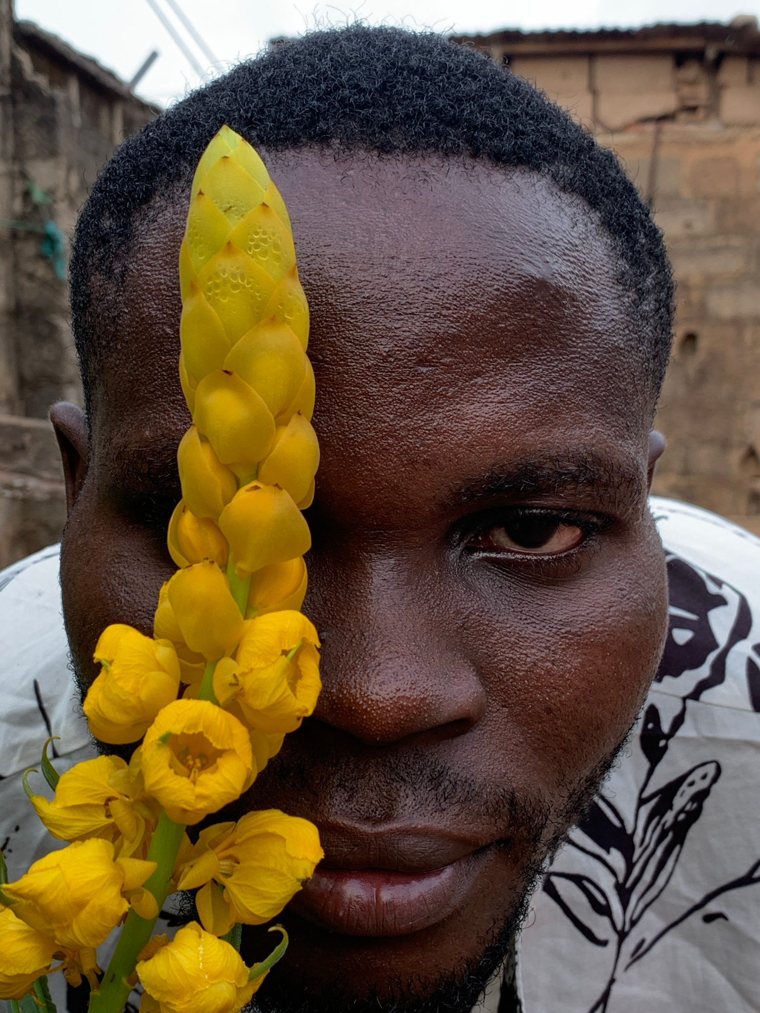 A close-up portrait shows a dark-skinned man with tightly coiled black hair, holding a stem of yellow flowers against his face. The flowers appear to be candlestick senna. The background is blurred anβ¦read more